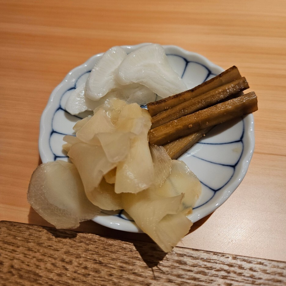 츠케모노 漬物 절임은 무, 우엉, 생강으로 구성되어 있다.