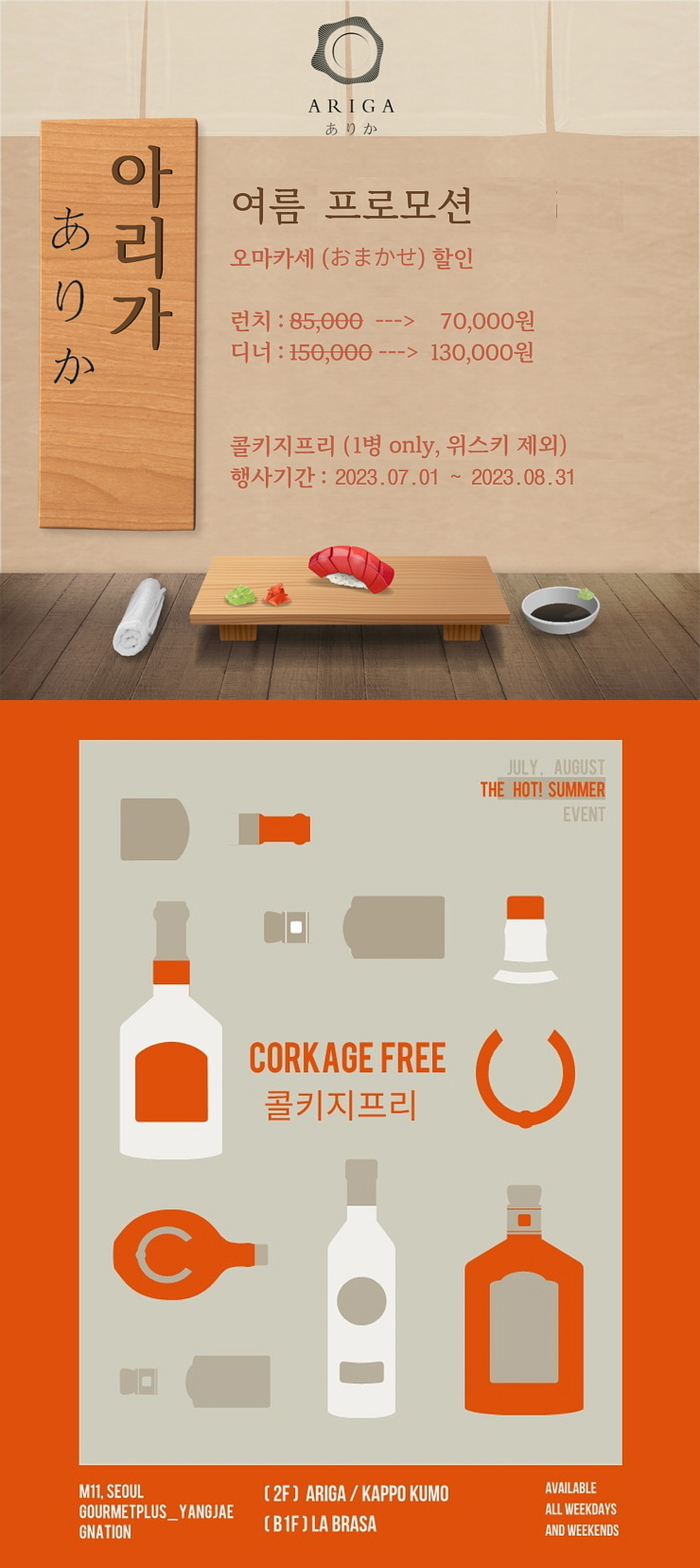 참고로, 2023년 7월~8월 말까지는 여름 행사로 런치 7만 원, 디너 13만 원의 할인 및 콜키지 프리로 진행 중이다.