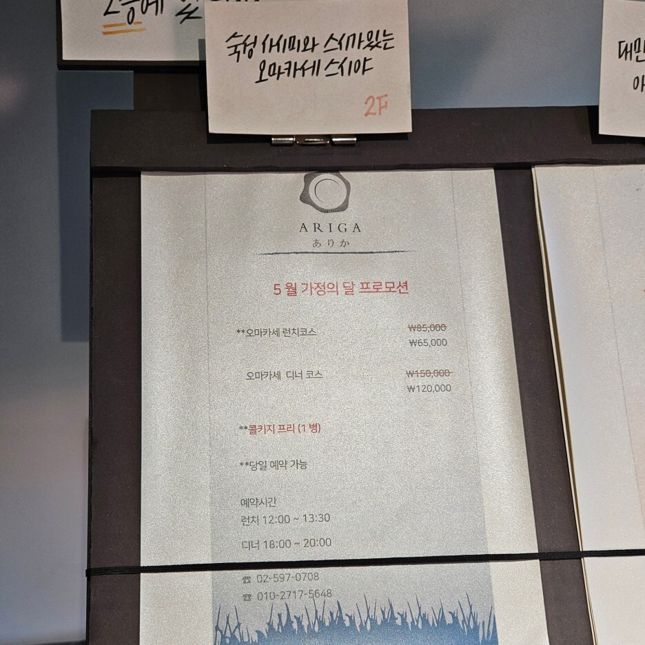 스시 아리가가 위치한 건물의 입구는 골목 안쪽에 있다. 큰 길가에서 안쪽으로 들어가서 1층에 도착하면, 요금 안내표가 있는데, 원래는 5월 가정의 달 프로모션을 진행하고 있다는 것을 알 수 있다.