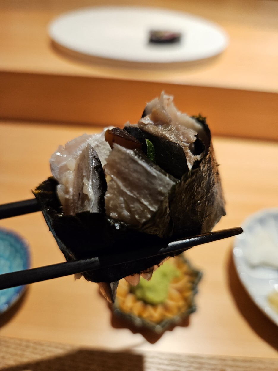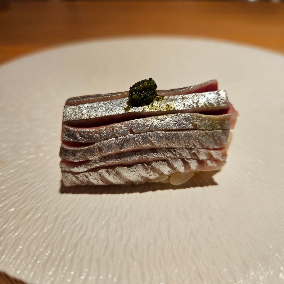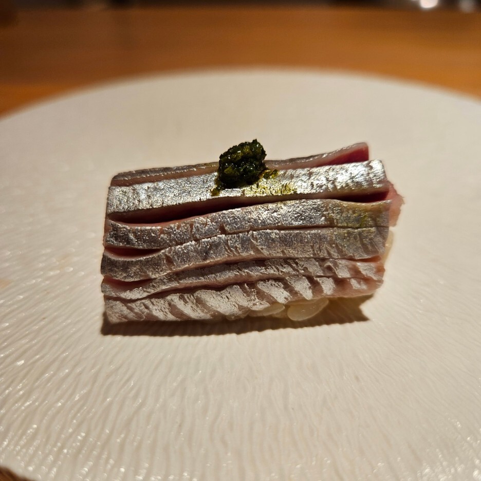 맛있었던 청어. 비싸지 않은 생선임에도 스시야에서 먹는 청어는 언제나 맛있는 것 같다. 쉽게 비린맛이 날 수 있고, 잔가시도 많아 그만큼 손질이 어려운 생선이라 원가는 저렴하지만 인건비가 많이 들어가는 재료이겠다. 야쿠미, 향을 내기 위한 고명의 시소향이 조금 강한 느낌이었다.