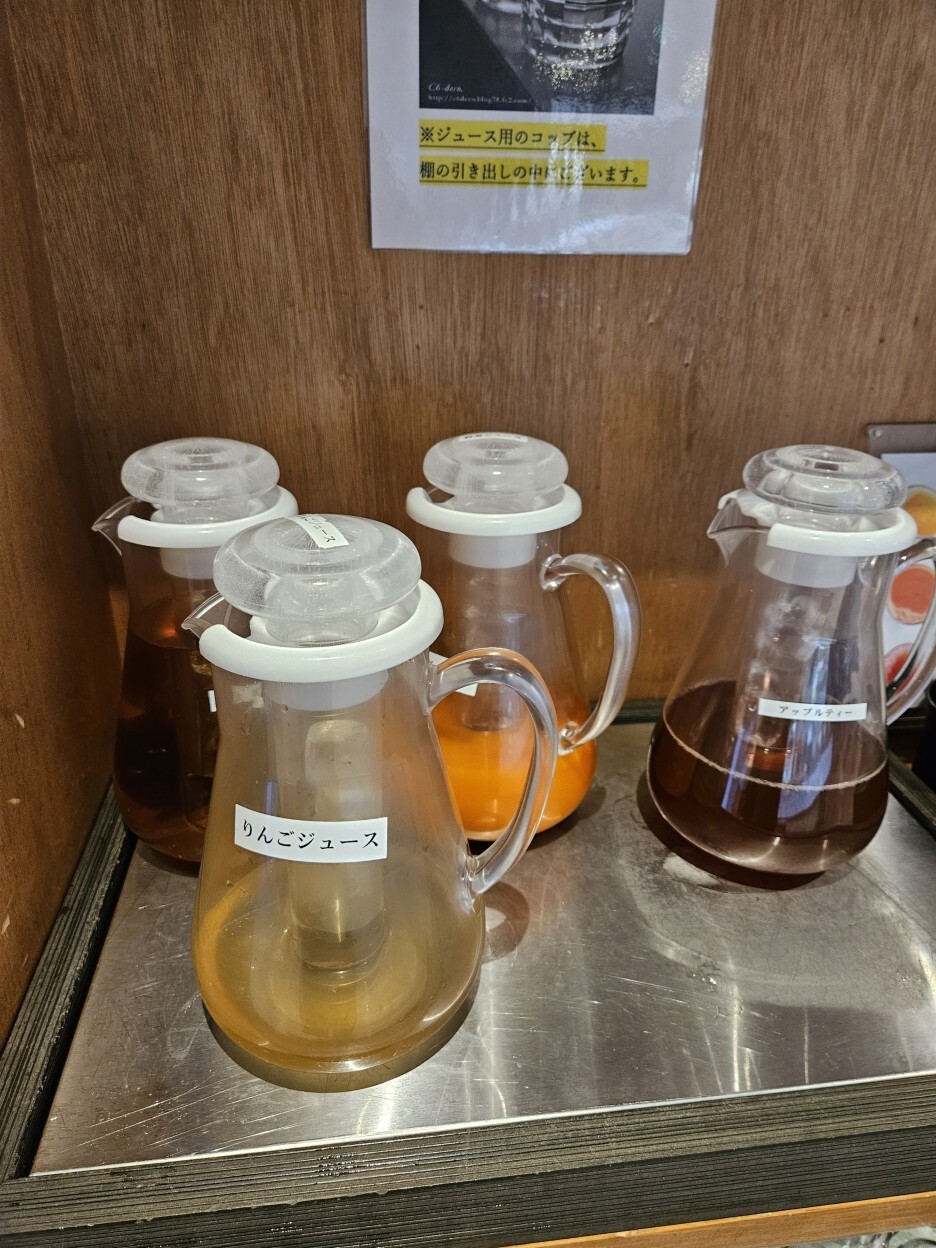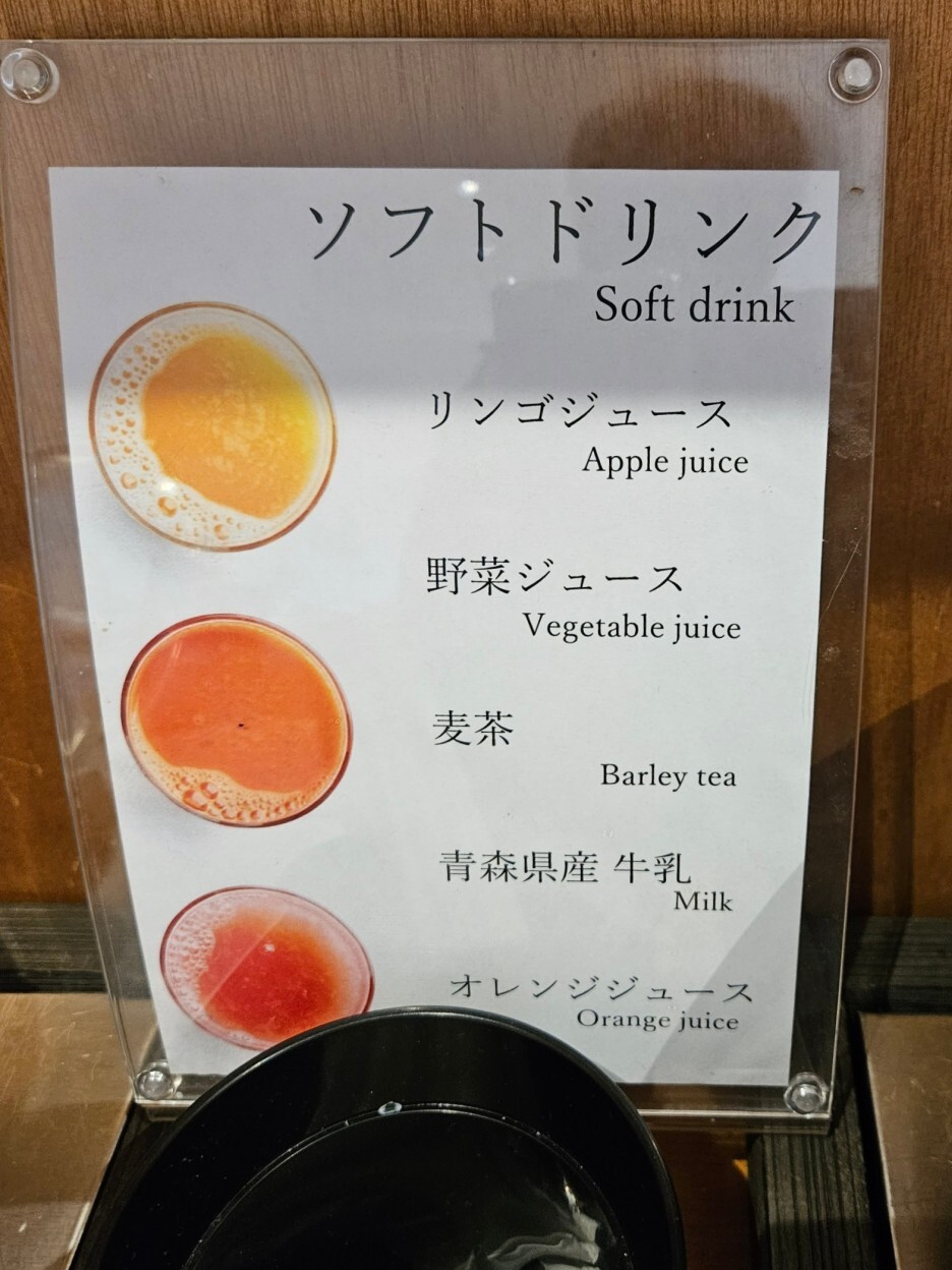 주스 종류도 다양하다. 아오모리 대표의 사과주스. 그리고 오렌지 주스와 야채주스, 보리차, 아오모리현 우유.