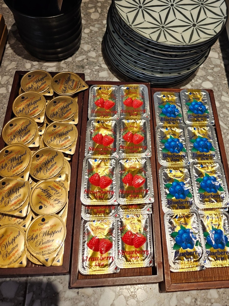 각종 빵, 버터와 잼.