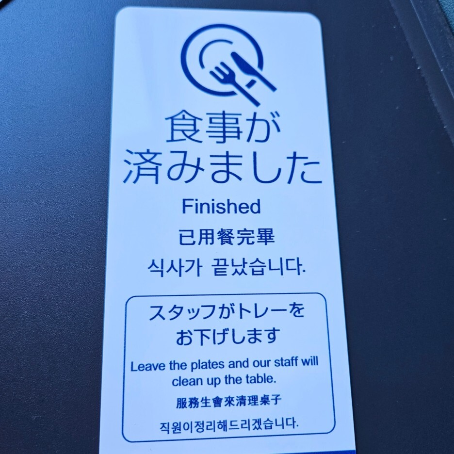 레스토랑에 들어가면 직원분께서 작은 푯말을 하나 주신다. 식사 중인지 식사 종료 인지를 알려줄 수 있는 푯말로, 뒤집으면 식사가 끝났음을 알려줄 수 있다.