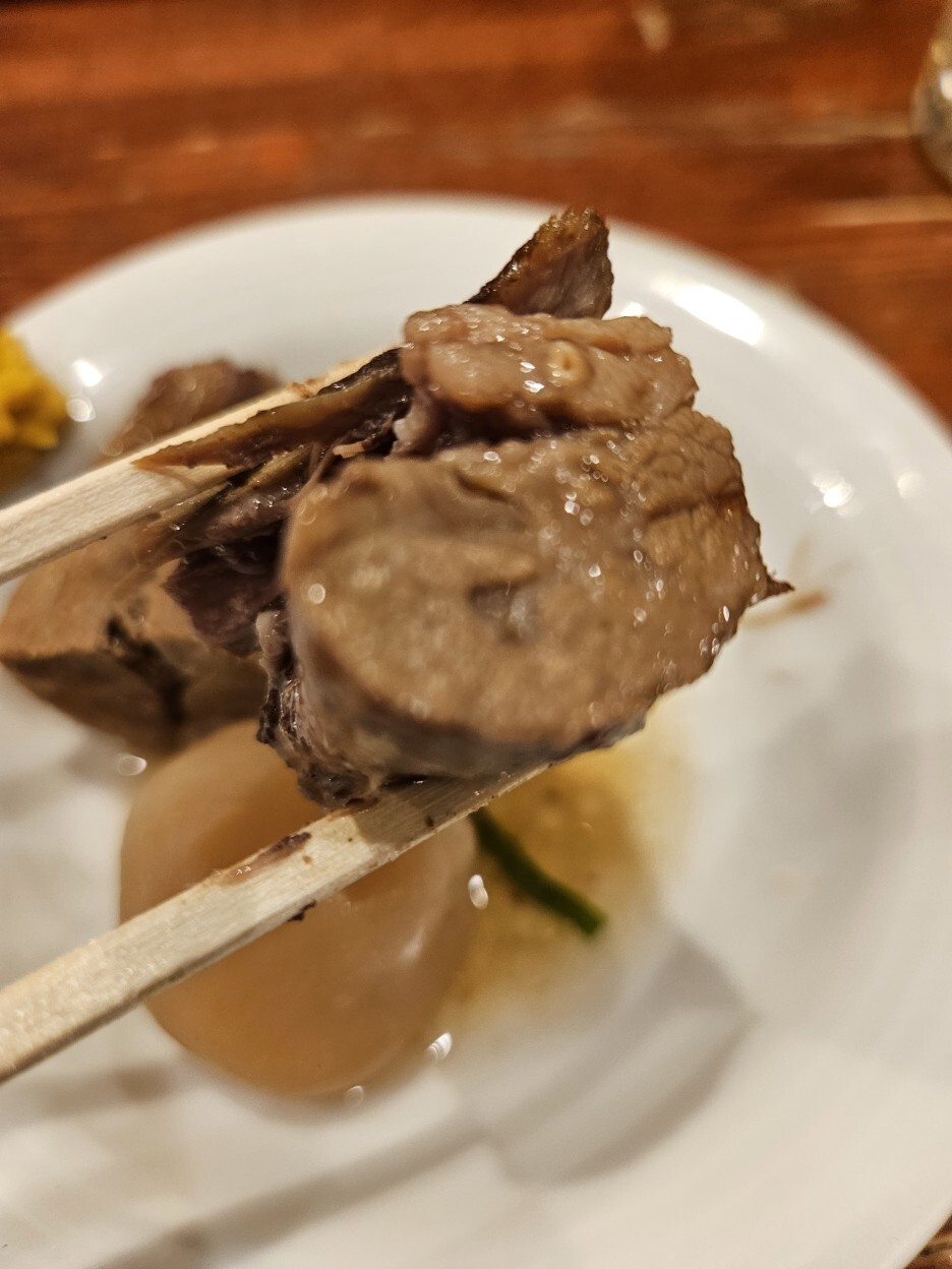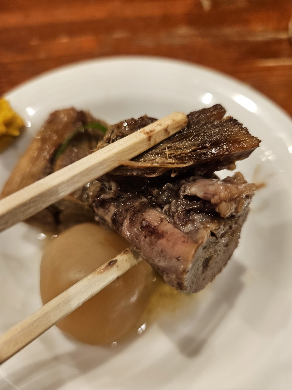 가쿠니 옆은 토란인 줄 알았더니 곤약이다. 소스에 적당히 졸여져서 쫄깃한 식감에 깊은 맛이 배어있다.