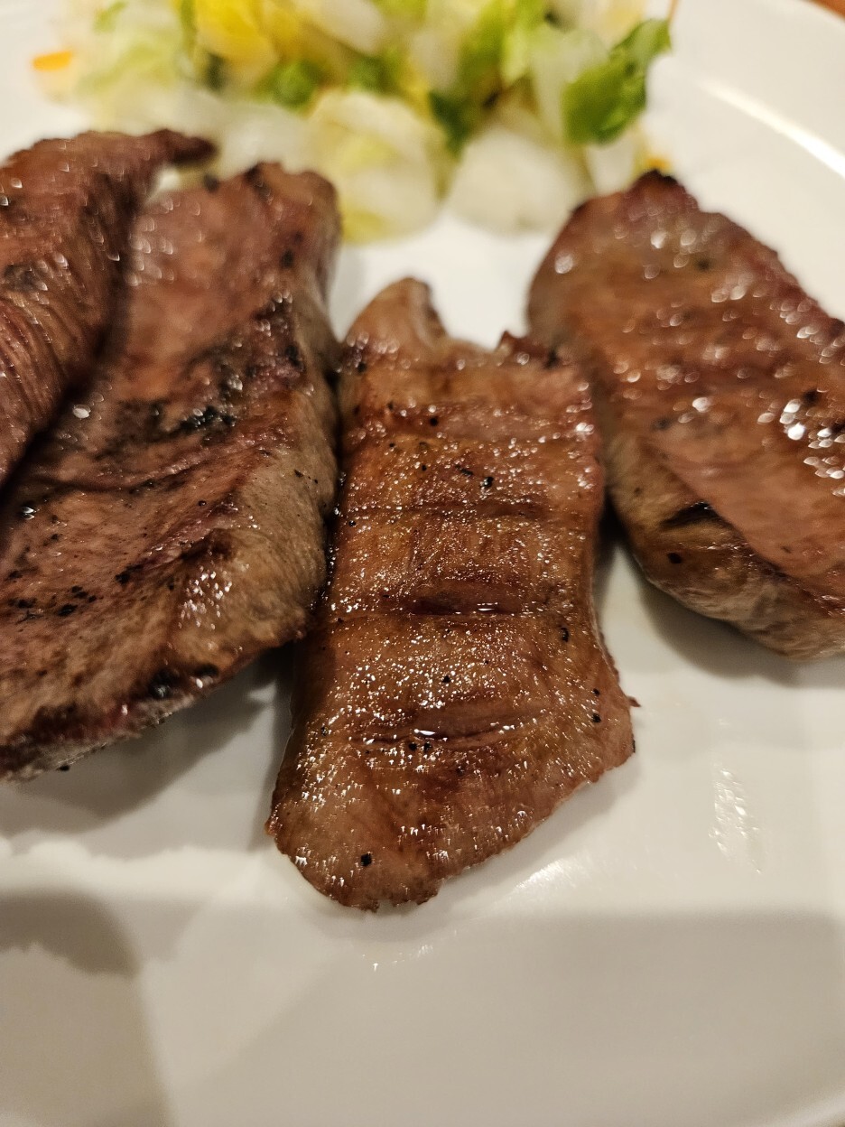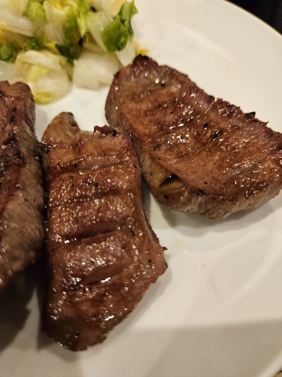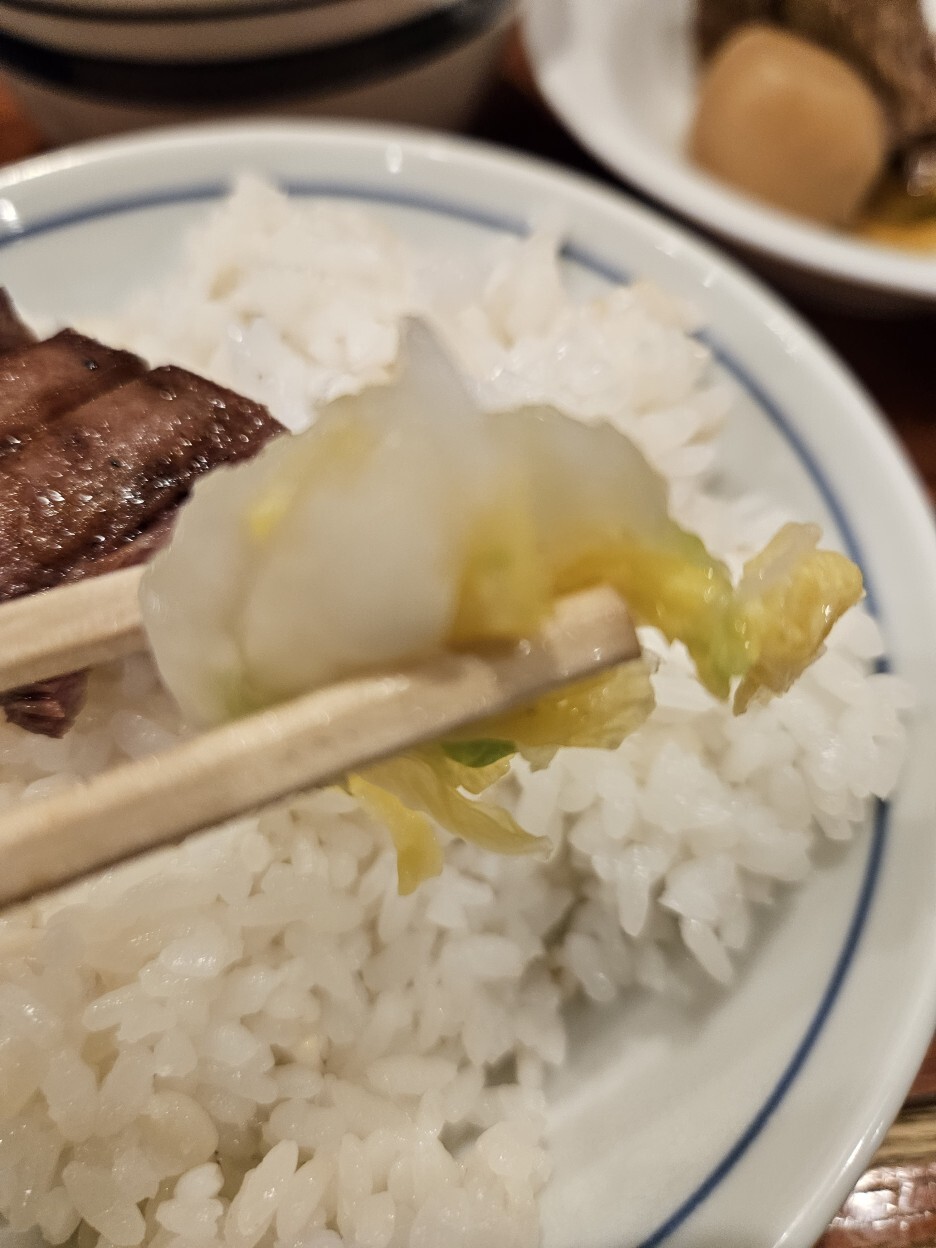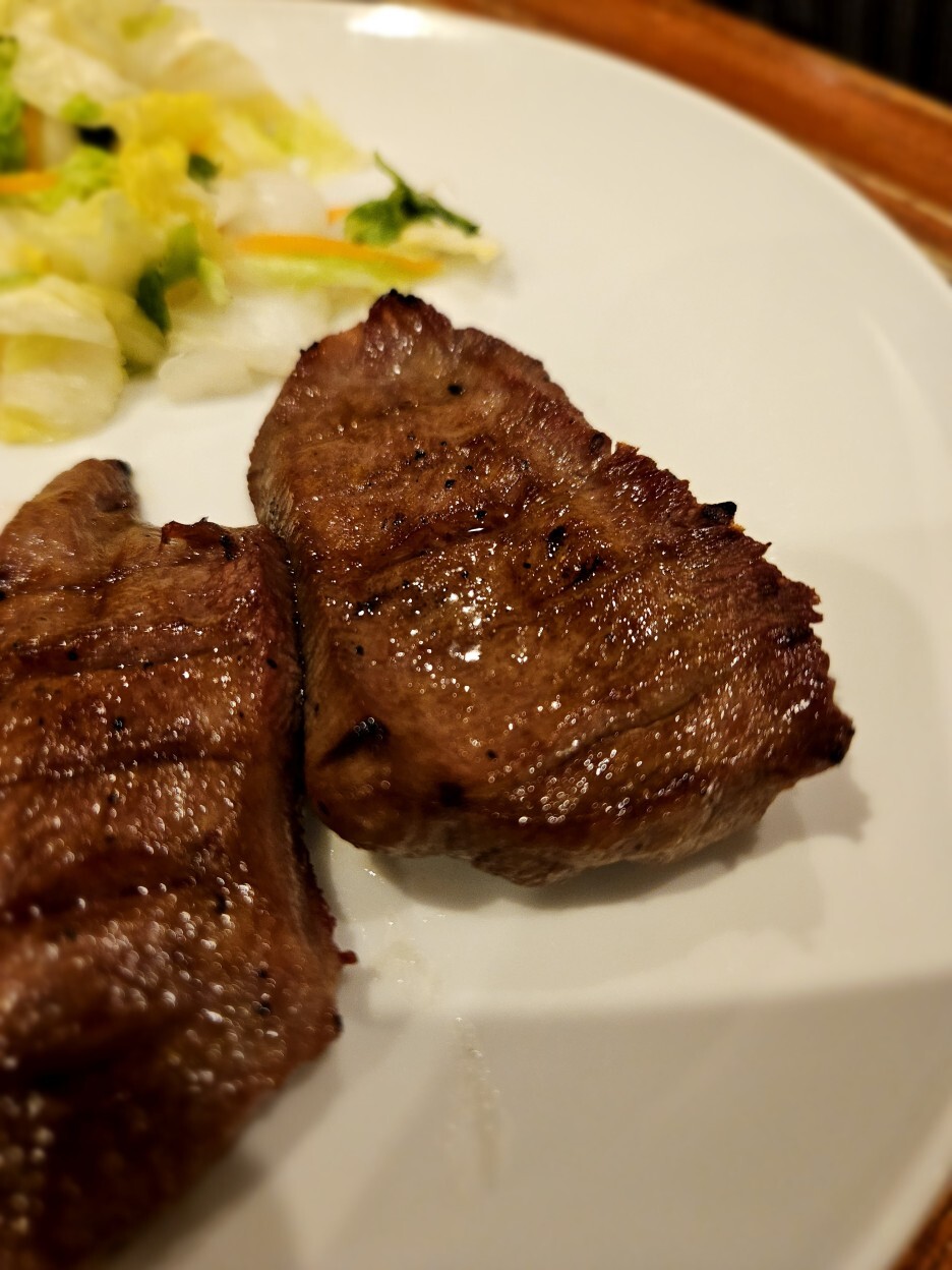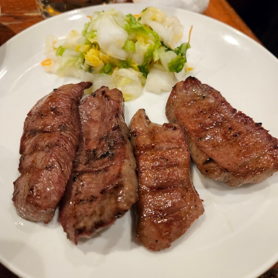 드디어 나온 탕구이 정식. 세금 포함으로는 2,288엔. 다른 메뉴도 시켰기에 가장 양이 적은 4장짜리로 주문했다. 고기 4점에 2만3천원이면 역시 만만치 않은 가격이다. 우설 4장과 간단한 반찬으로 배추절임이 함께 나온다. 규탕은 적당히 흐르는 육즙과 그릴 자국이 정말 완벽하게 구워진 모습이다.