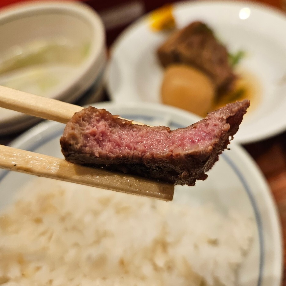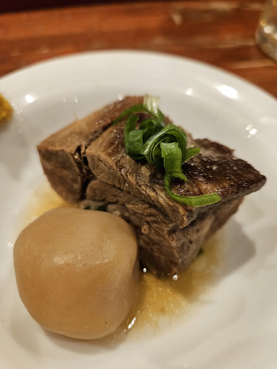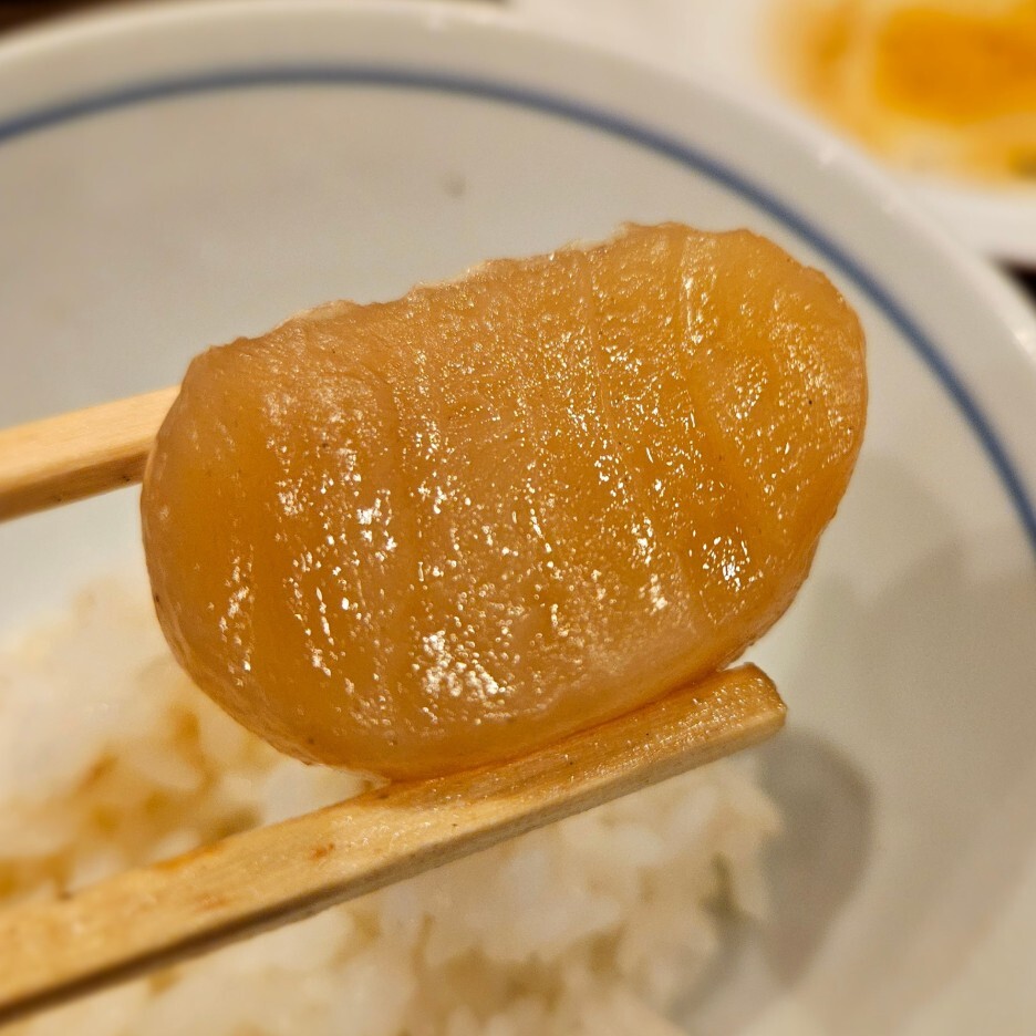 단품으로도 판매하는 탕카쿠니는 580엔(세금미포함). 아마도 오토시로 나올때는 양이 조금 적어서 가격 차이가 있는 듯하다. 탕카쿠니 たんの角煮의 이름을 살펴보면, たん 탕은 우설을 말하며, 角煮 카쿠니는 각지게 자른 고기의 조림이라는 의미. 보이는 모습은 우리나라 장조림과 비슷한 느낌이다. 탕가쿠니는 부드러운 게 규스지 먹는 맛. 또는, 우리나라의 꼬리찜 같은 식감이다.