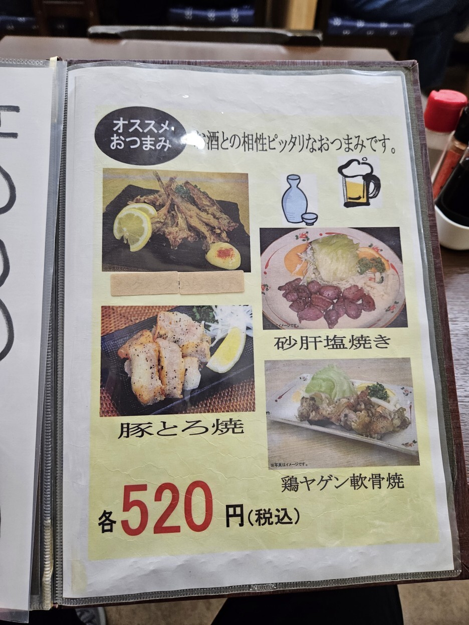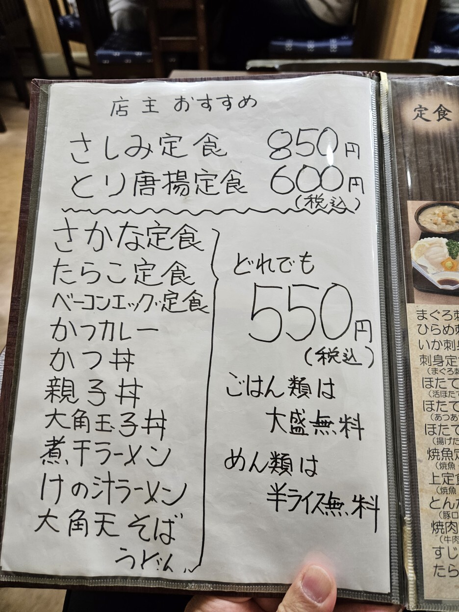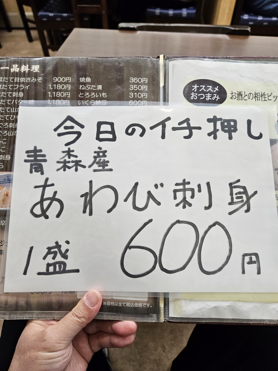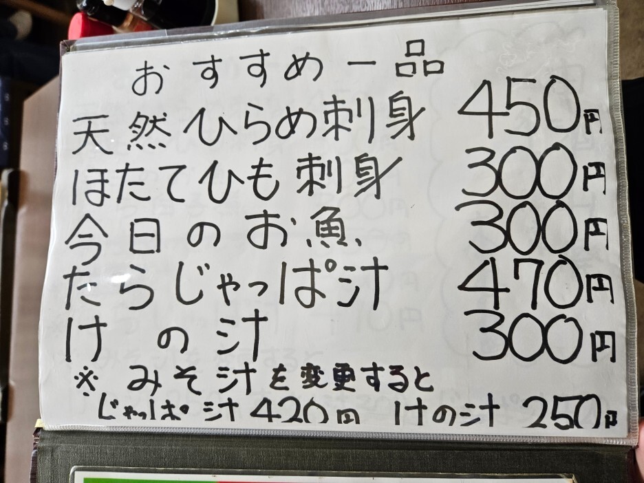 바로 전날 이 식당에서 운영하는, 같은 건물 2층에 있는 이자카야를 방문했었는데, 재밌게도 동일한 추천 메뉴가 있었다. 전날 이 메뉴 중 천연 광어 회 450엔을 먹었었다.