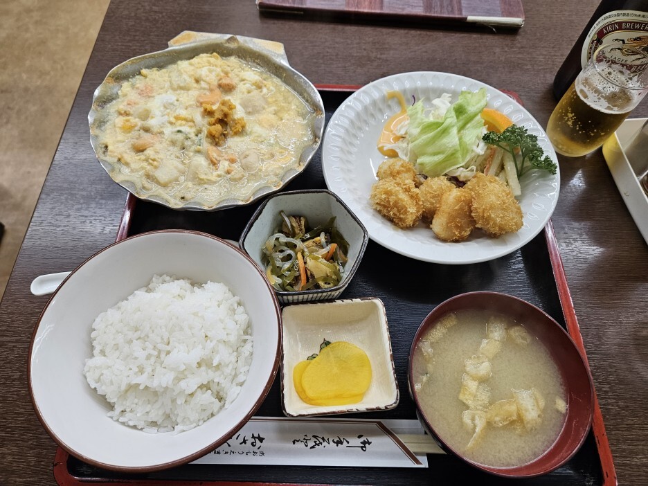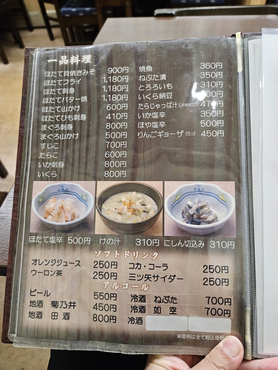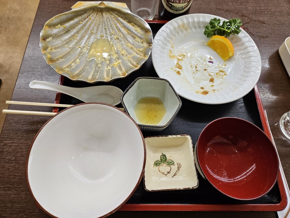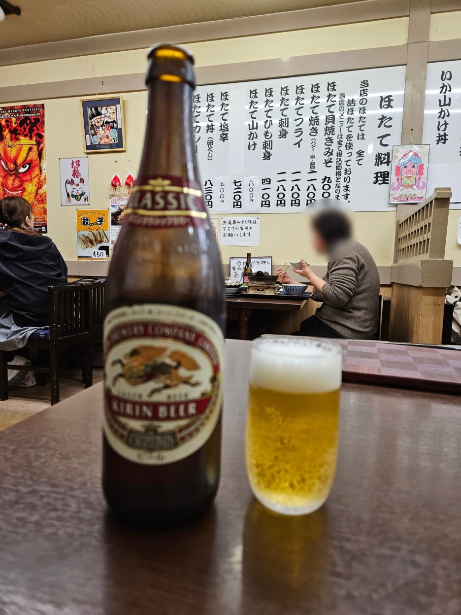 메뉴를 천천히 보니, 아오모리에서 유명한 명물인 호타테 관련 요리가 많고, 여러 가지 일본 가정식 요리가 정말 많다. 세어보니 정식 종류만 20가지다. 당연히 여기서 제일 유명한 걸 먹어야 될 것 같아, 유튜브에서 모든 사람들이 먹던 호타테 카이 야키 미소 정식을 주문해 먹기로 했다. 이것만 해도 1100엔. 싸진 않다. 조금 더 고민하다 오기 전부터 먹고 싶었던 호타테 후라이를 시키기로 했다. 이런 튀김류를 시키게 되면 그럼 또 맥주를 안 시킬 수 없지.