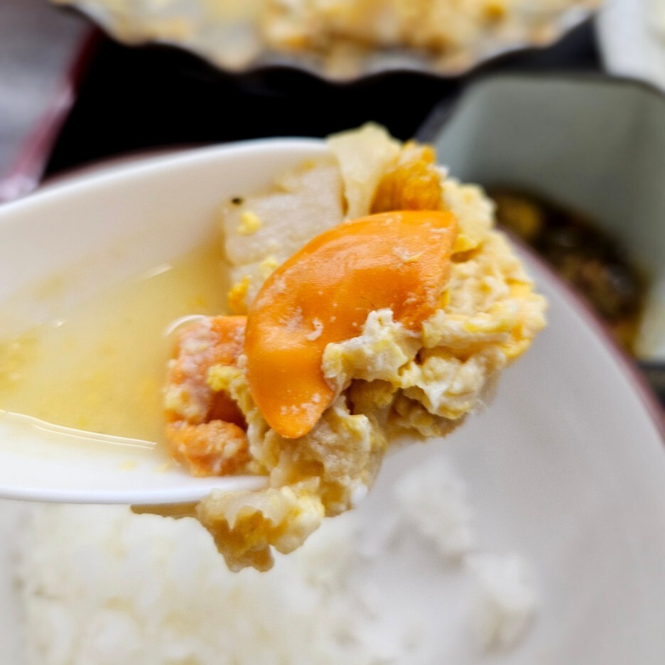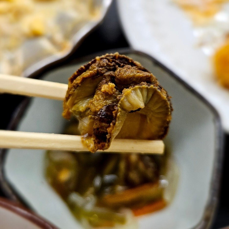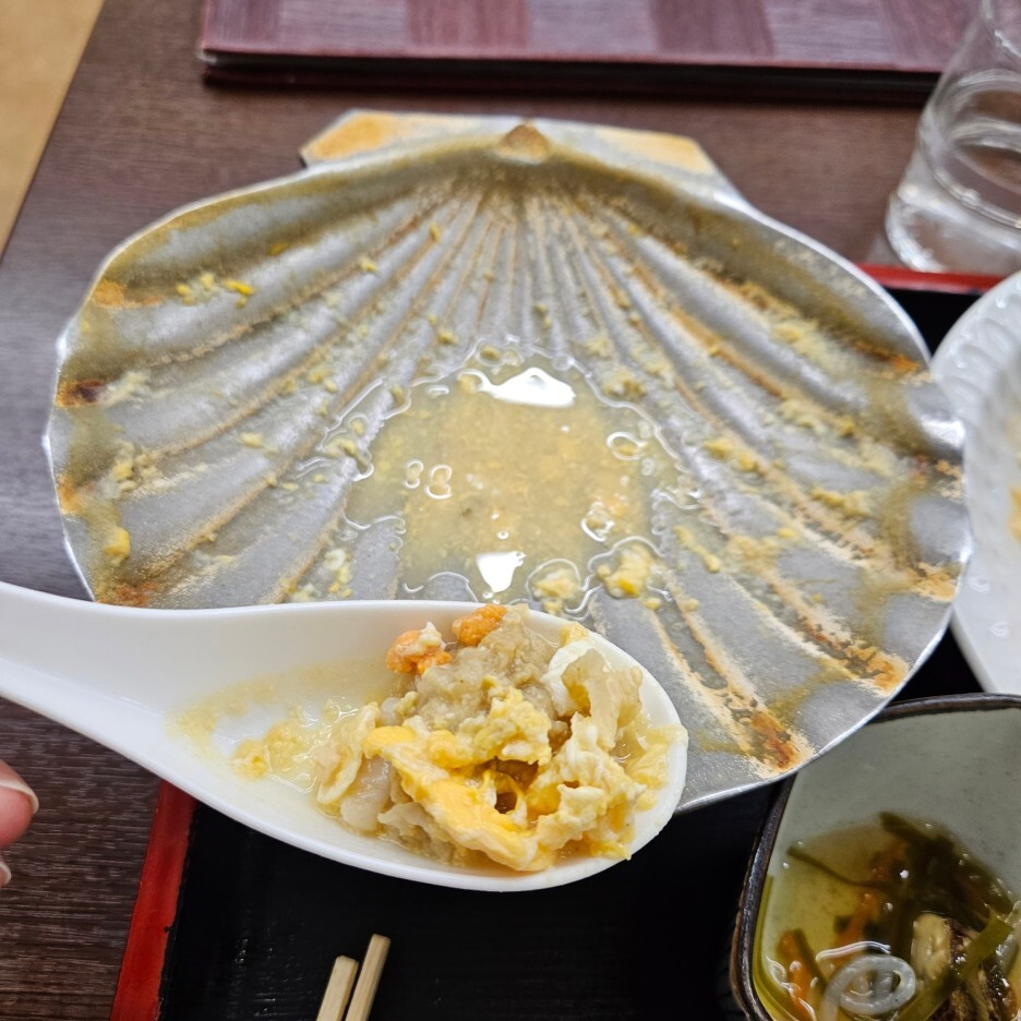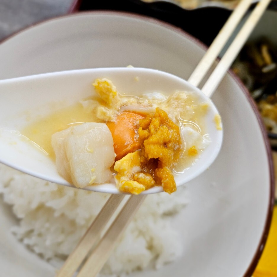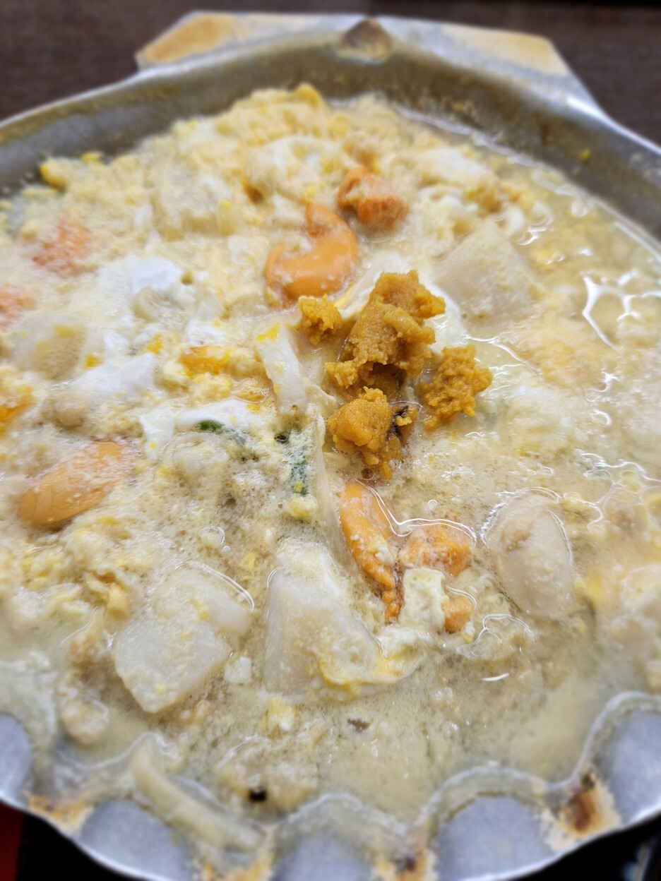 들어가 있는 가리비가 엄청 부드럽고 사각사각 씹힌다. 전형적인 일본의 나베 맛이 나고, 우리나라 식으로 얘기하자면 아주 부드러운 계란탕에 가리비와 다른 몇 가지 조개 그리고 성게가 올라가 있다.