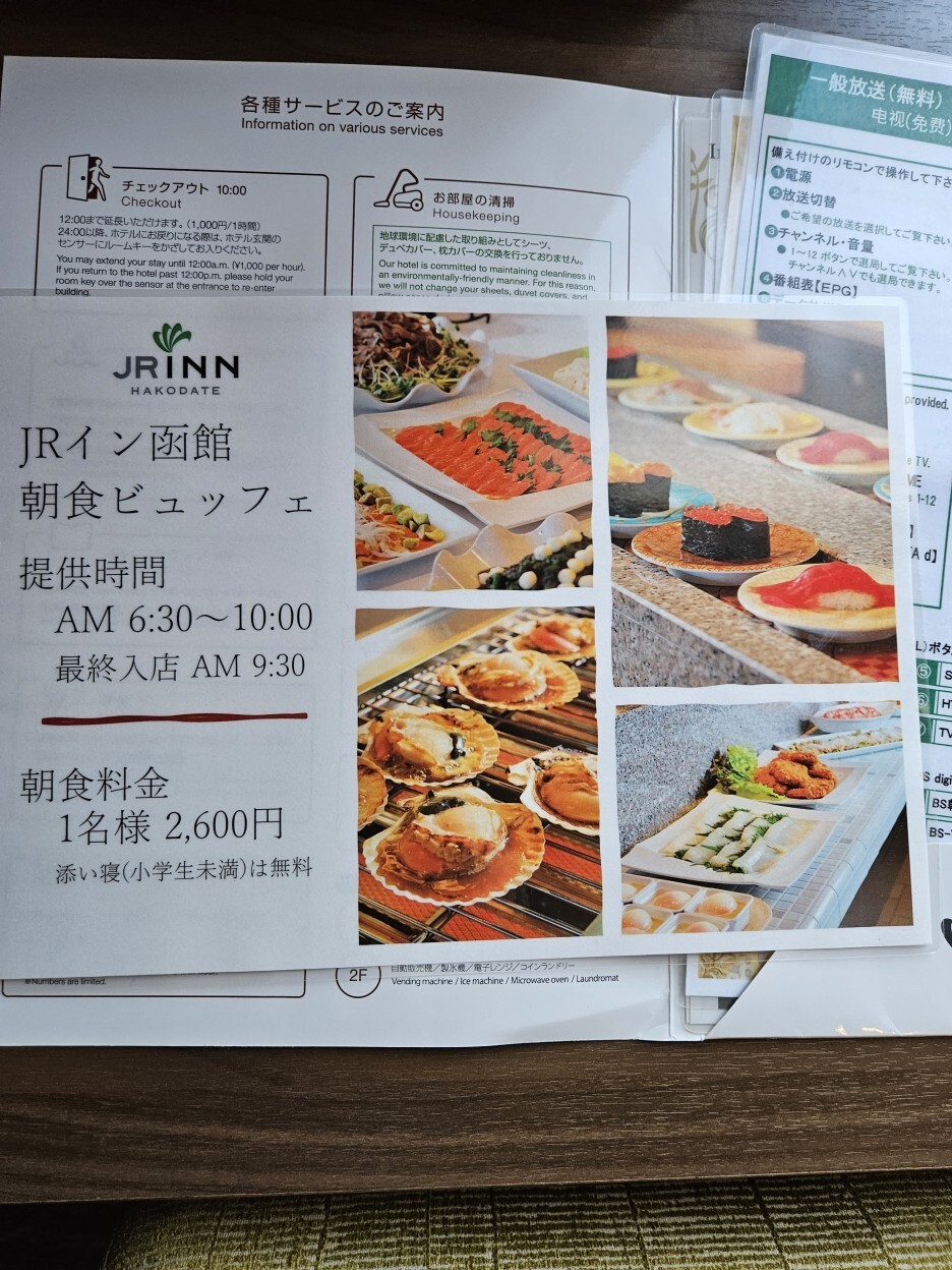조식의 안내. 하코다테라 그런지 조금 비싸다. 2,600엔. 나는 조식을 신청하지 않았지만 아침에 식당 앞을 지나갈 때 보았는데, 무려 스시를 직접 바로 만들어 주시더라. 가격이 비쌀만했다.