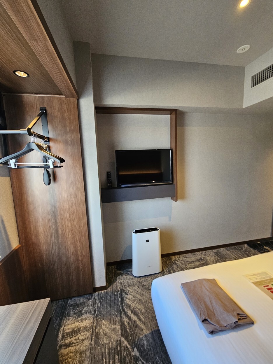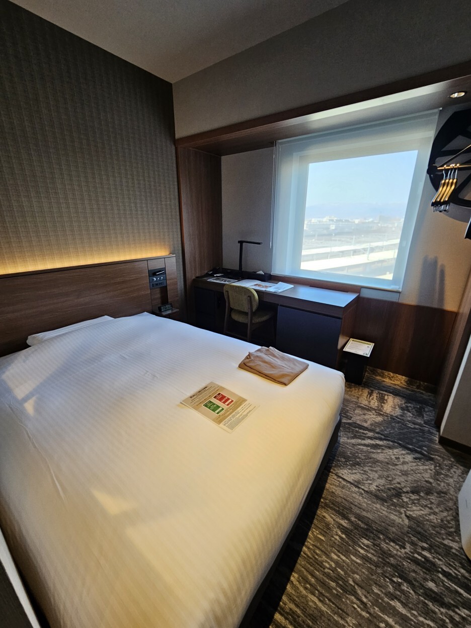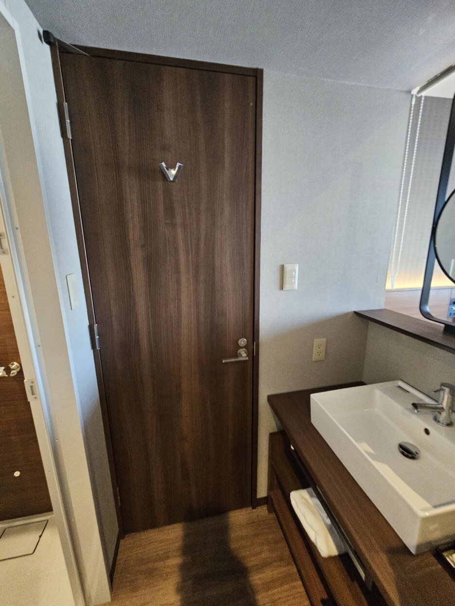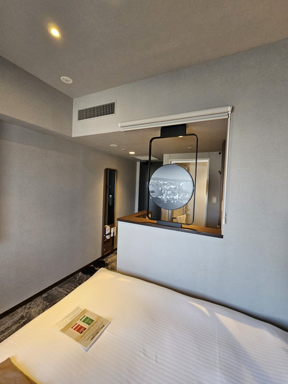 내가 예약한 방은 싱글 룸. 그런데 구조가 재미있다. 세면대가 밖으로 빠져 건식으로 되어 있는데, 이 모습이 상상외로 고급스러웠다. 방 크기는 16㎡의 일반적인 일본 호텔과 유사한 크기. 침대도 140cm로 넓은 편이다. 거기다 시몬스 매트리스로 편하다.