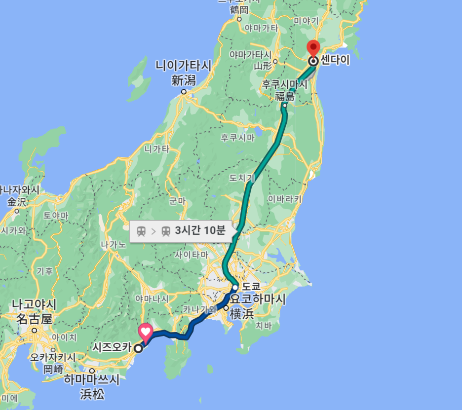 JR 시즈오카역에서 JR 센다이역까지