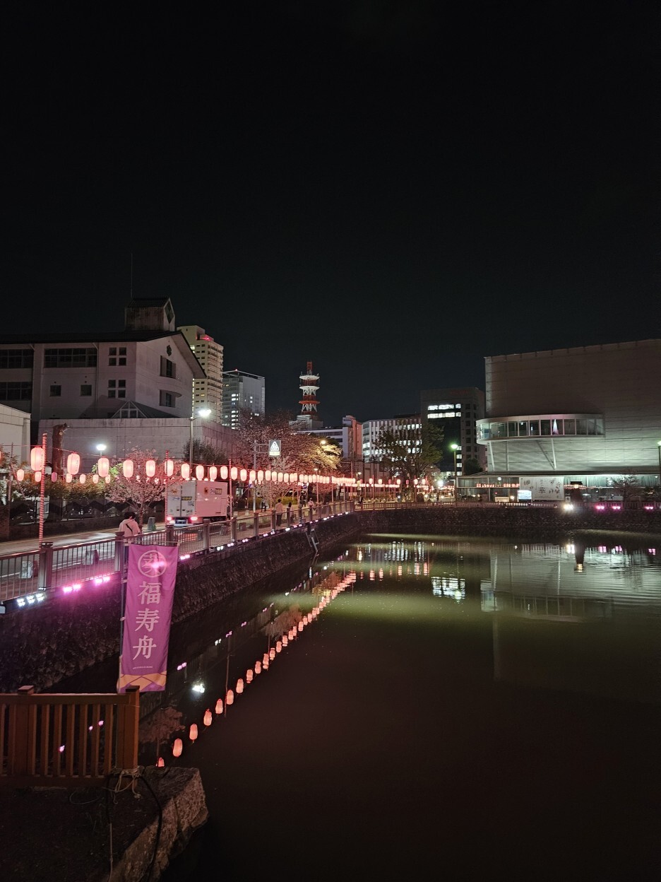 해자 옆으로 길게 달아둔 등들이 축제 분위기를 한껏 만들어 주는 듯하다. 일본스러운 관경.