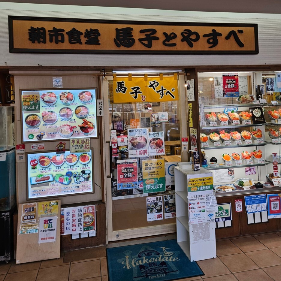 北海道函館市の朝市食堂 馬子とやすべは、どんぶり横丁市場の正面にございます。新鮮な魚介類を使用した料理を取り揃えております。通信販売も行っておりますので当店の味を各ご家庭で