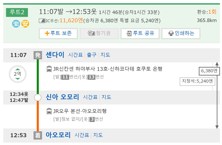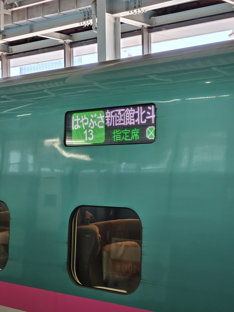 한번 열차를 갈아타야 하는데, 신칸센은 아오모리역이 아닌 신아오모리역에 정차를 하기 때문이다. 일본의 주요 도시는 옛날부터 이용하던 주요 역에 신칸센을 정차하도록 만들어져있는데, 아오모리는 그렇지 않았다. 오사카역에 신칸센이 정차하지 않고 신오사카역에 정차하는 형태와 같은 것 같다.