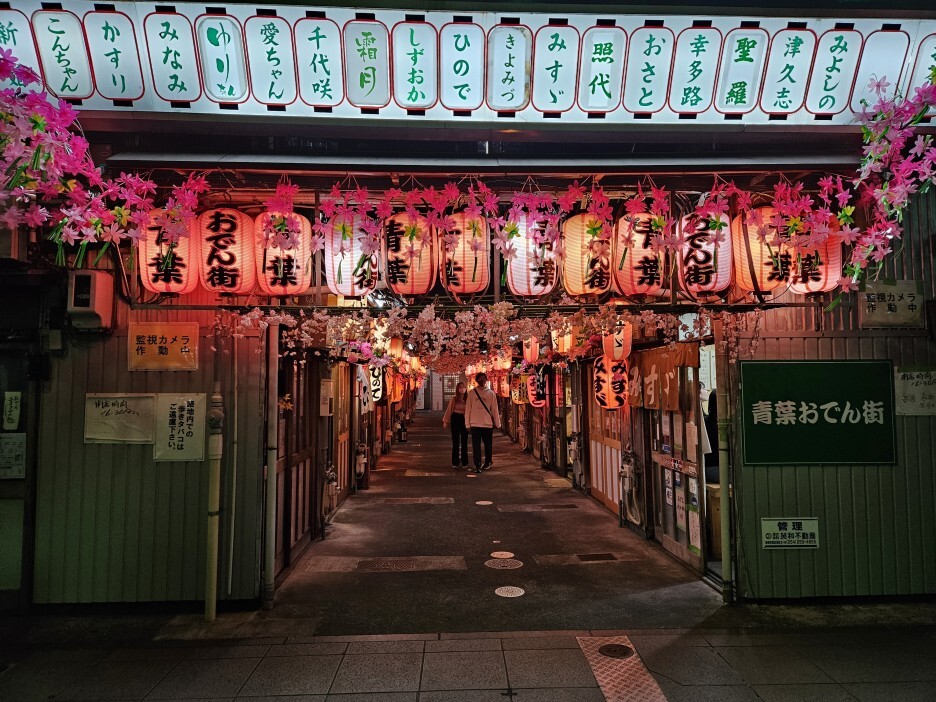 빌딩이 즐비한 현대식 거리에 갑자기 나타나는 쇼와 40년대 분위기의 복고풍 골목길이다. '아이짱', '오사토', '코우타로', '미요시노', '미즈즈', '낭만' 등의 간판을 내건 오뎅집이 스무 개 정도의 가게가 줄지어 있다. 모두 한 칸 정도의 작은 가게로 카운터에 10명 정도 앉으면 만석이지만, 포장마차 분위기 그대로 유리문 너머에서 오뎅 냄비를 둘러싸고 즐겁게 담소를 나누는 소리가 들린다.