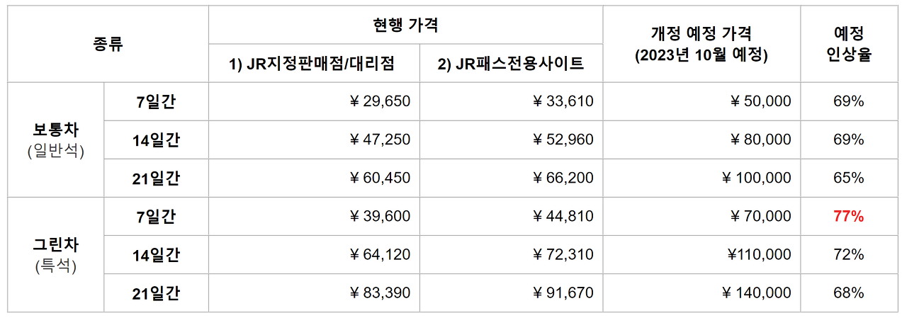 하지만 JR전국패스 같은 경우, 일반석에 비해 가격이 엄청나게 비싸지는 않다.