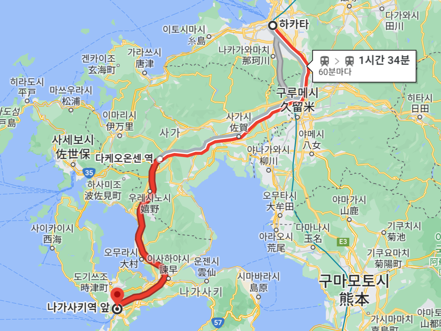 하카타에에서 나가사키까지는 신칸센이 모두 연결되어 있지는 않다.