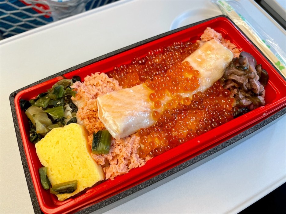 매콤하게 절인 참치 절임과 연어알 간장 절임을 초밥과 함께 들어가 있는 에키벤. 이름 그대로 고급 식재료인 참지 마구로와 연어알 이쿠라가 엄청 들어가 있어 맛있어 보인다. 달걀지단과 초밥은 또 그 조합이 훌륭하니 밥 차체로도 맛있을 듯하다. 하지만, 이쿠라가 과연 비리지 않을까 조금 의심이 되긴 한다.