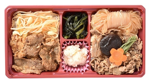 - 쌀밥, 소갈비구이, 콩나물무침, 나물무침, 감자 샐러드, 소고기 스키야키, 실곤약, 당근조림, 표고버섯조림