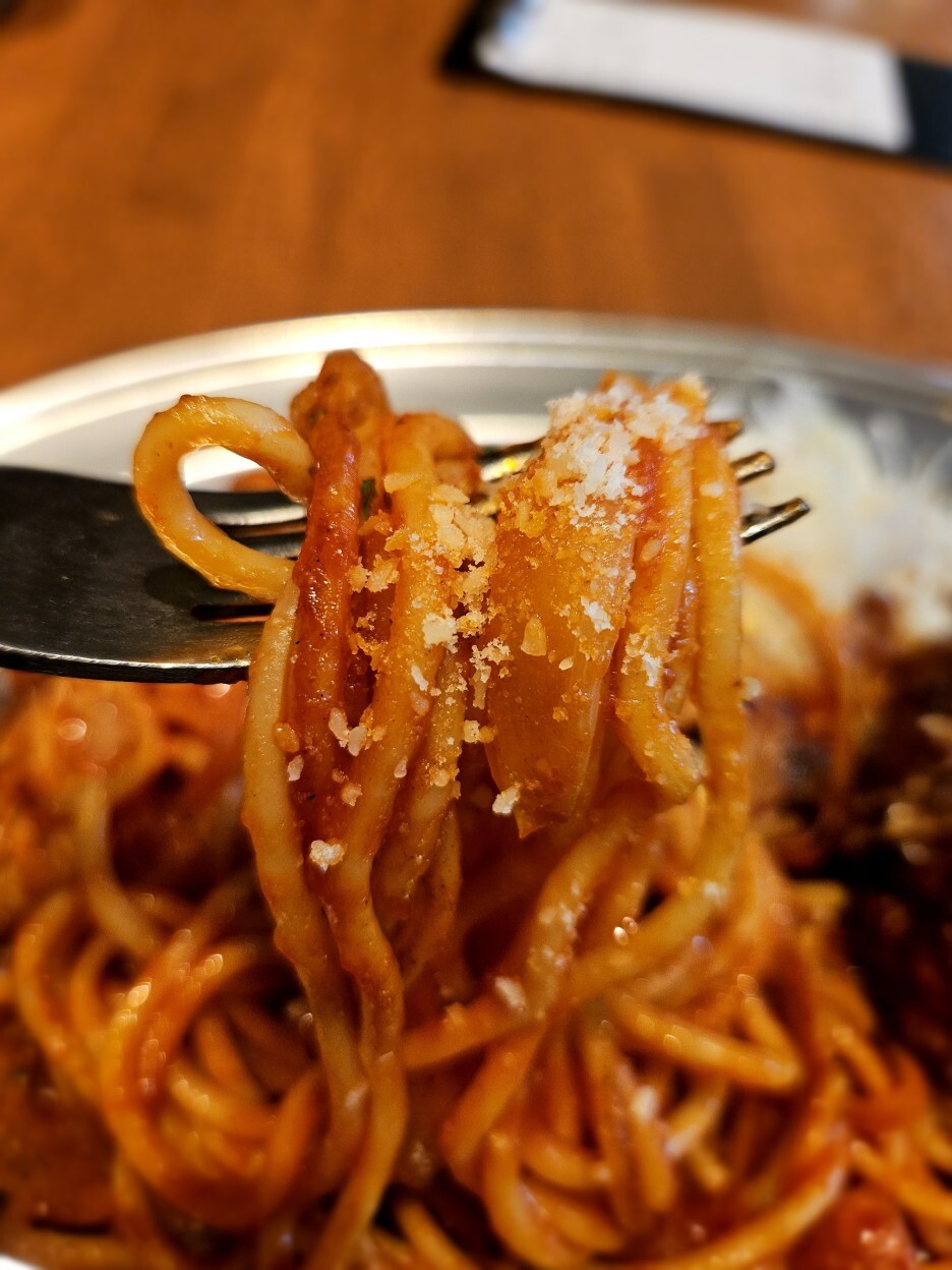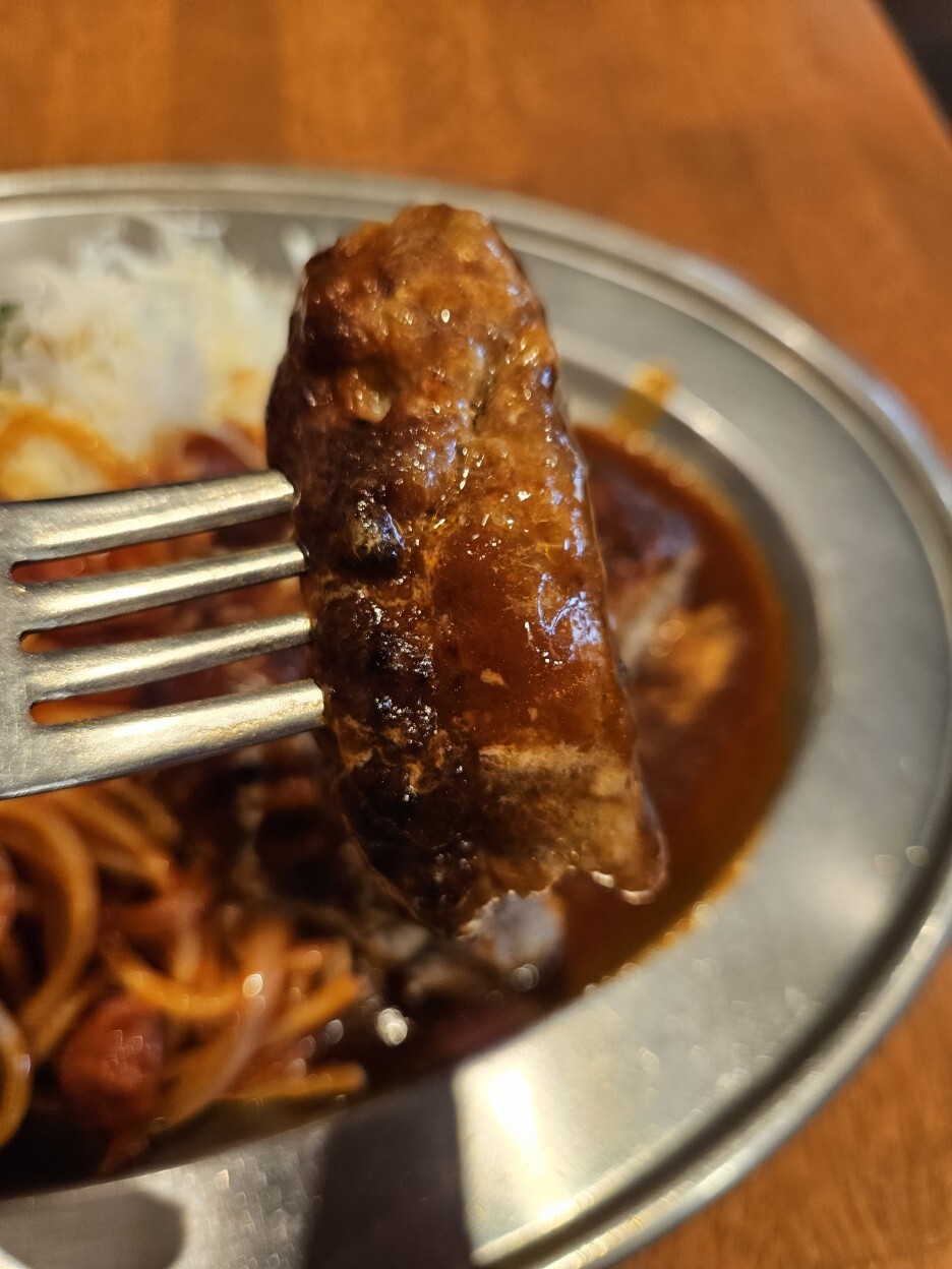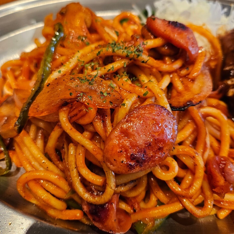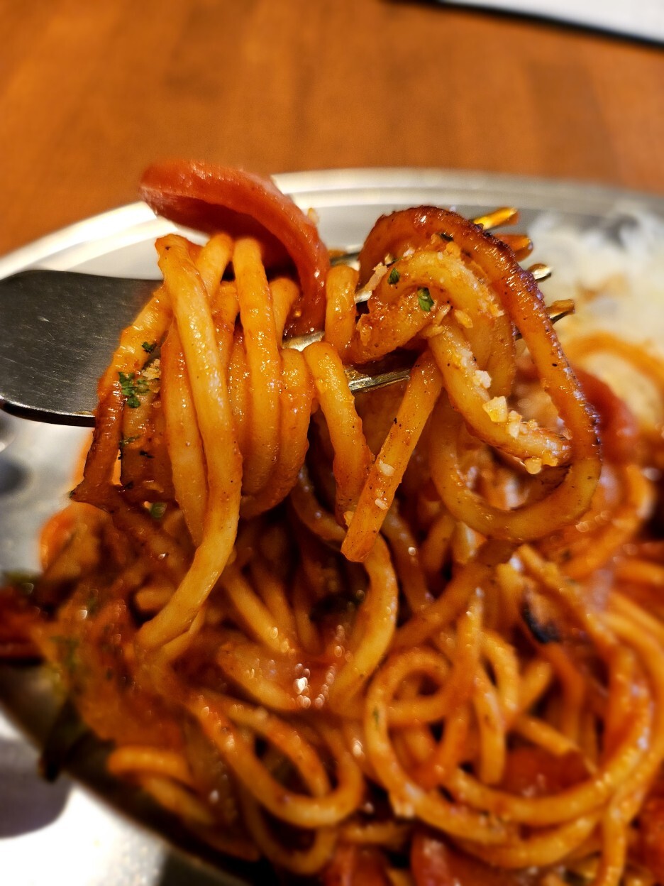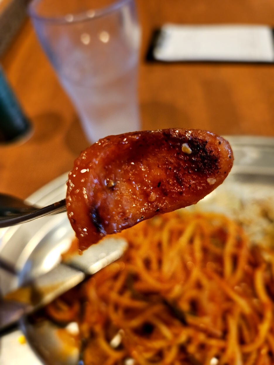 모양새는 너무나 훌륭하다. 케첩이 잘 발라진 스파게티면의 색도 훌륭하고 살짝 들어가 있는 소시지도 잘 구어진 느낌이다.