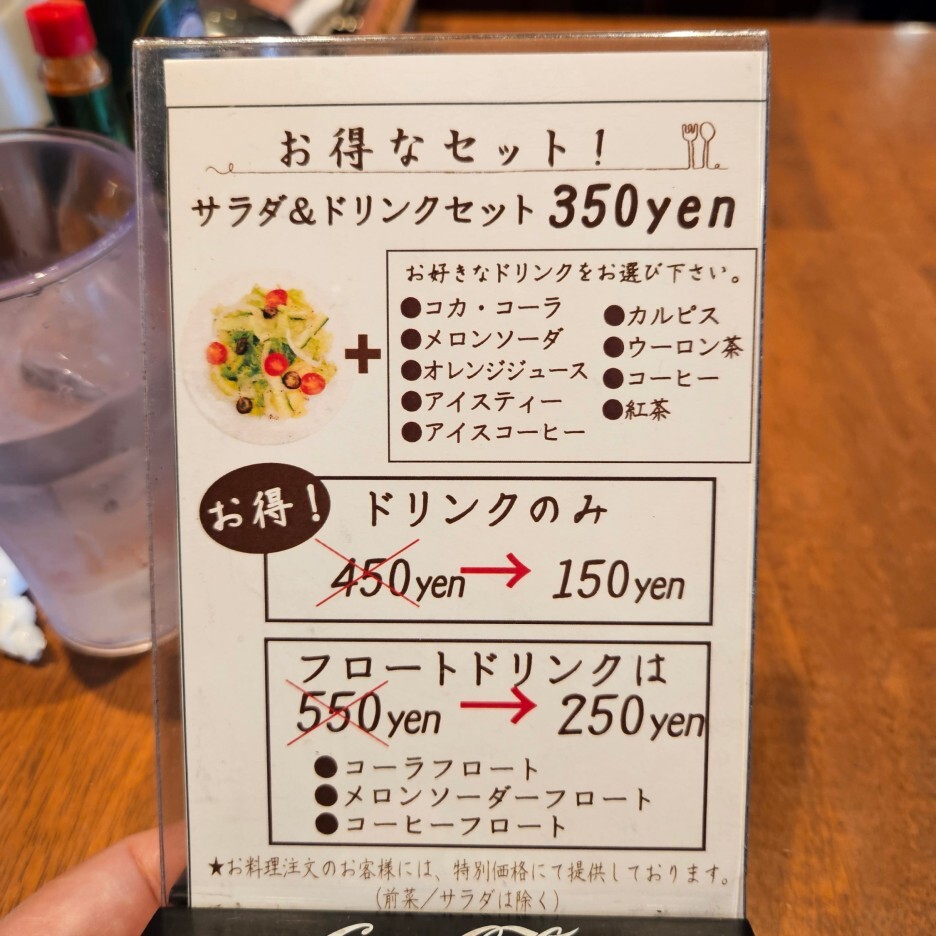 샐러드와 드링크 세트는 350엔 추가로 가능하고, 드링크만 추가하는 것은 150엔이다. 아이스크림이 올라가는 플로트 드링크 세트는 250엔 추가. 나는 굳이 음료수까지는 필요하지 않아 추가하지는 않았다.