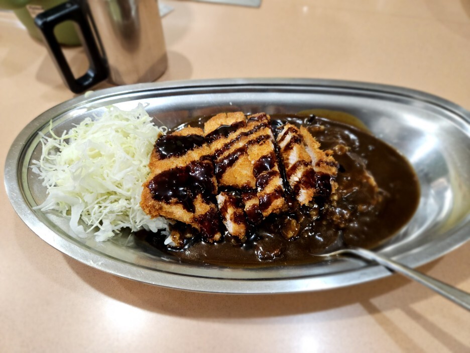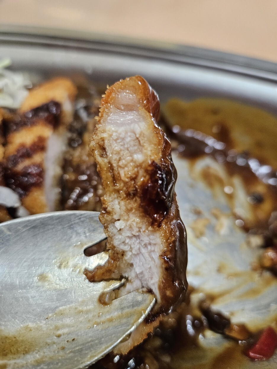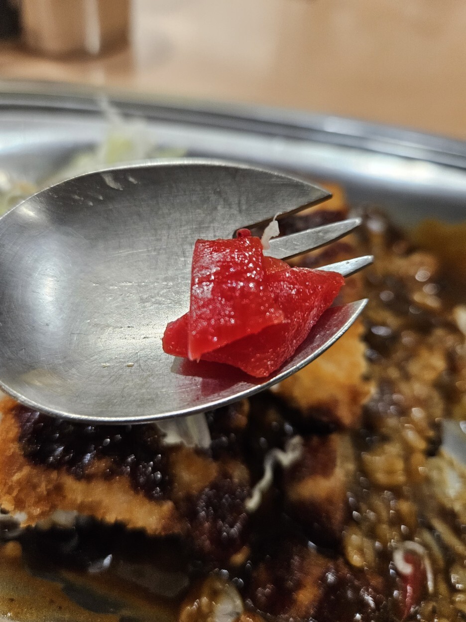 가나자와 카레의 원류 중 한 곳이라, 가나자와 카레의 조건이 정확하게 다 지켜진 느낌의 모습이다. 시커먼 카레 색과 그 위의 로스 카츠. 그리고 잘게 썬 양배추. 마지막으로 포크형 숟가락까지.