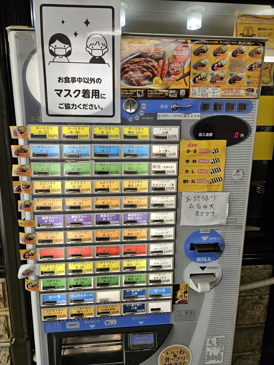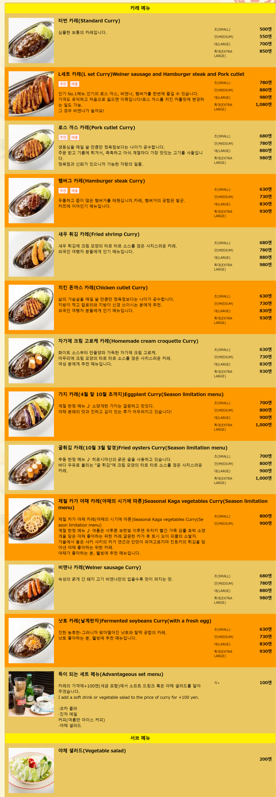 메뉴. 조금 복잡해 보이지만, 각종 카레의 대 중 소가 있고 추가 토핑으로 구성되어 있는 형태이다.