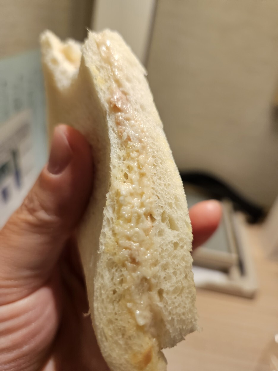 이미 한입 먹고 찍은 참치 샌드위치. 참치는 우리나라 통조림 참치의 맛과 식감이었으나, 함께 버무려진 소스가 맛있다. 아마도 마요네즈 베이스의 뭔가 일 텐데, 참치와 잘 어울리는 맛.