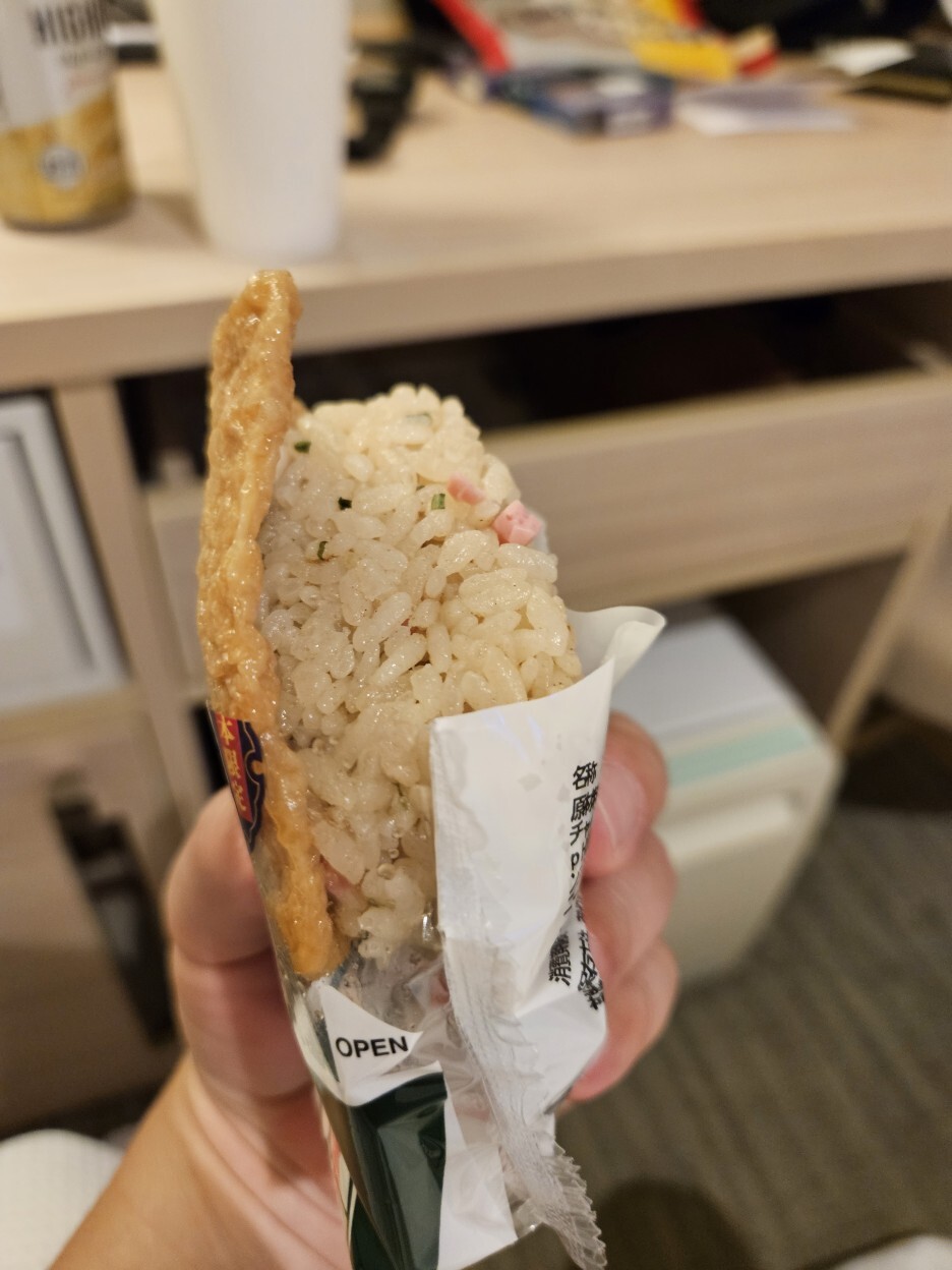함께 들어가 있는 밥은 유부의 양념과 유사한 맛으로 만들어진 느낌. 그리고 아주 조금 햄 같은 것과 파 조각이 씹힌다.