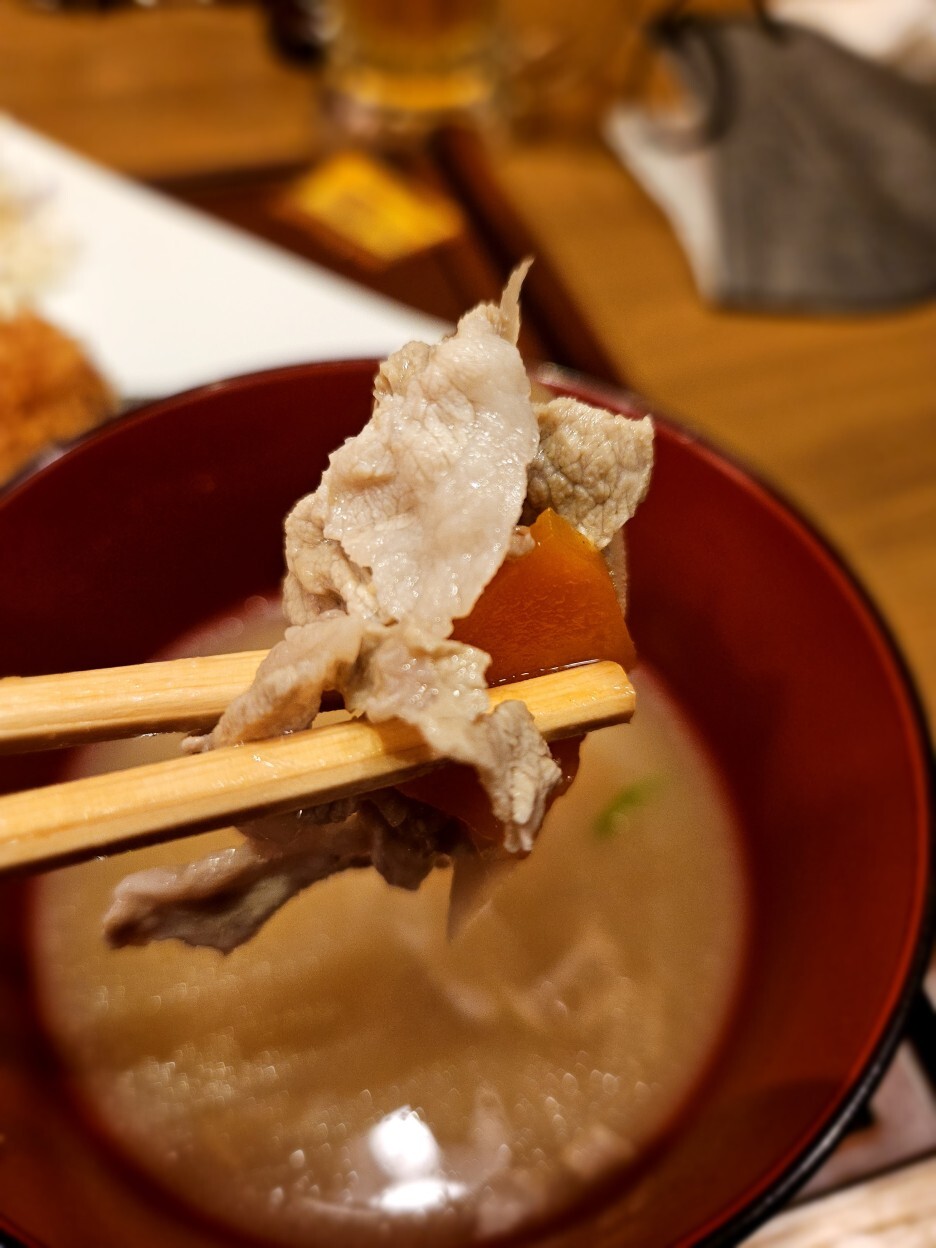 두꺼운 고기는 아니지만, 돼지고기도 충실하게 들어가 있다. 결국 나중에 돈지루는 오카와리, 리필을 해서 먹었다. 아주 훌륭한 돈지루였다.
