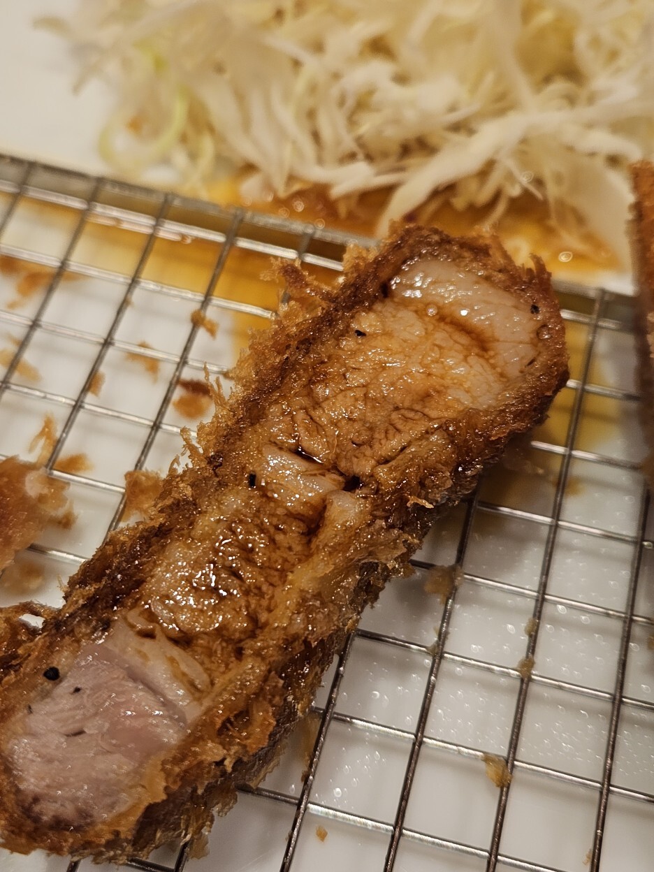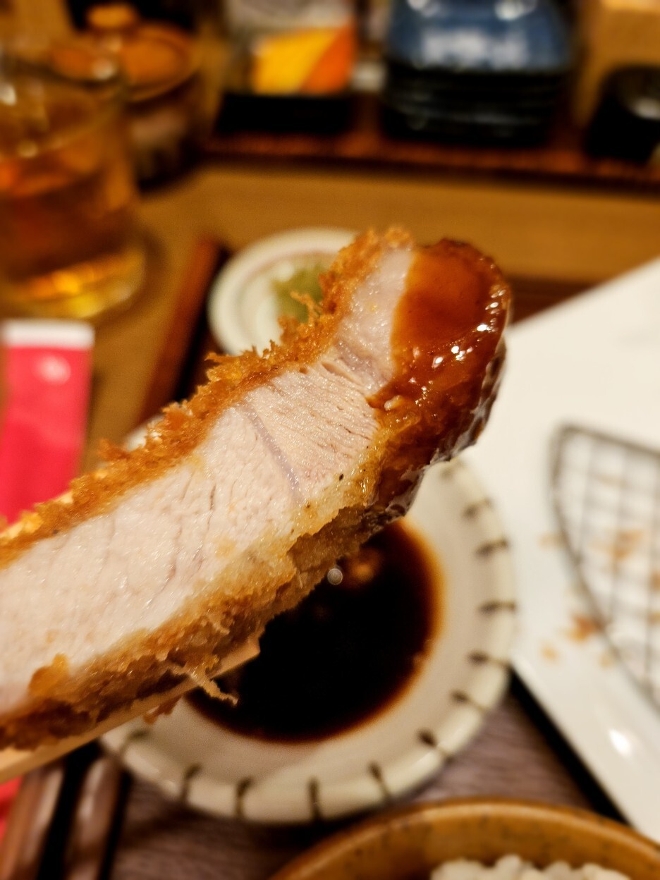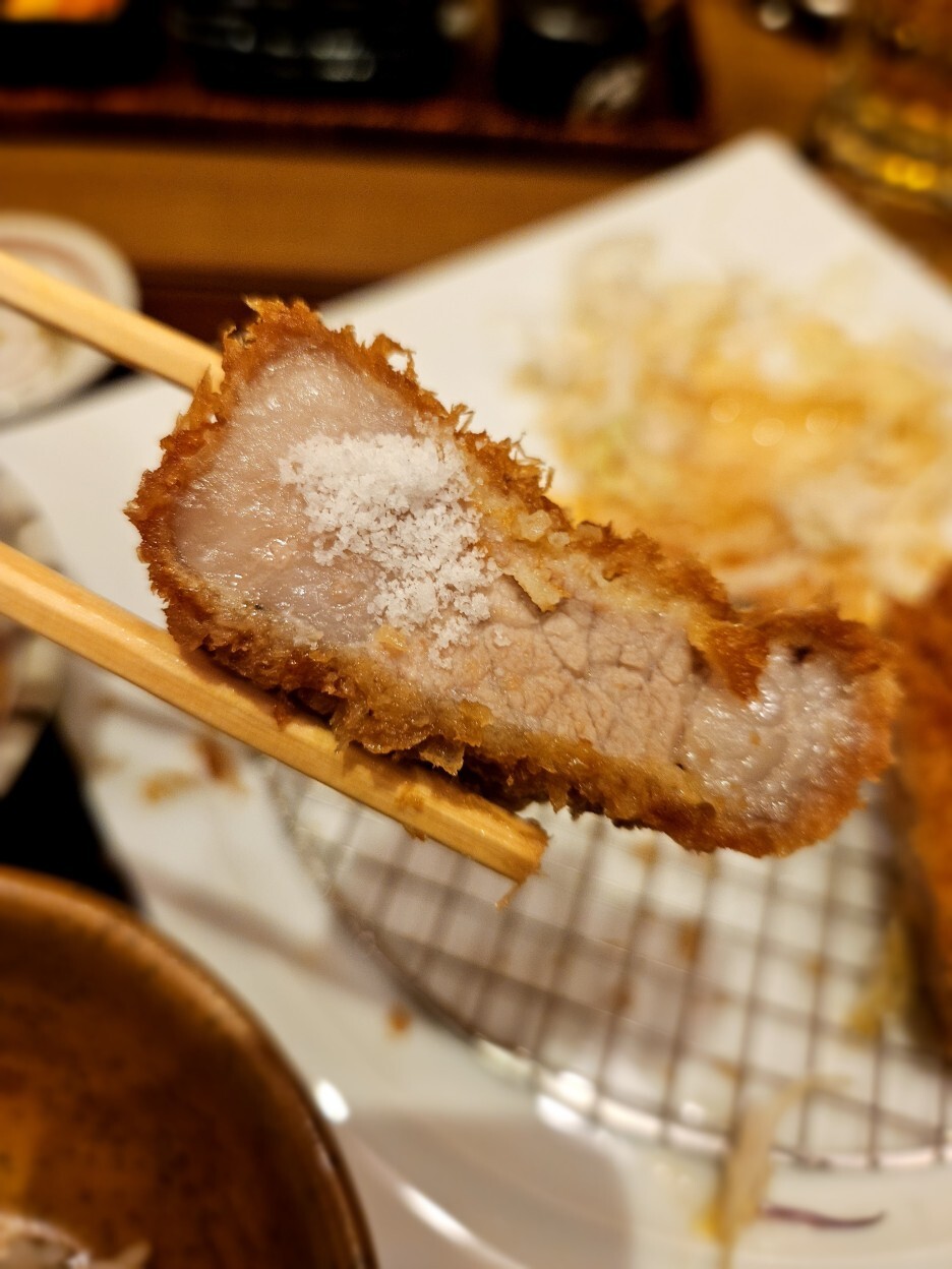먼저 클래식하게 일반 돈가츠 소스에 한입. 소스에 갈은 참깨가 함께 찍혀 올라오니 향이 꽤 강하다. 기름진 고기 튀김에 썩 잘어울리는 맛이다. 로스의 비계부분과 어울어지면서 고소함이 폭발하는 형태다.