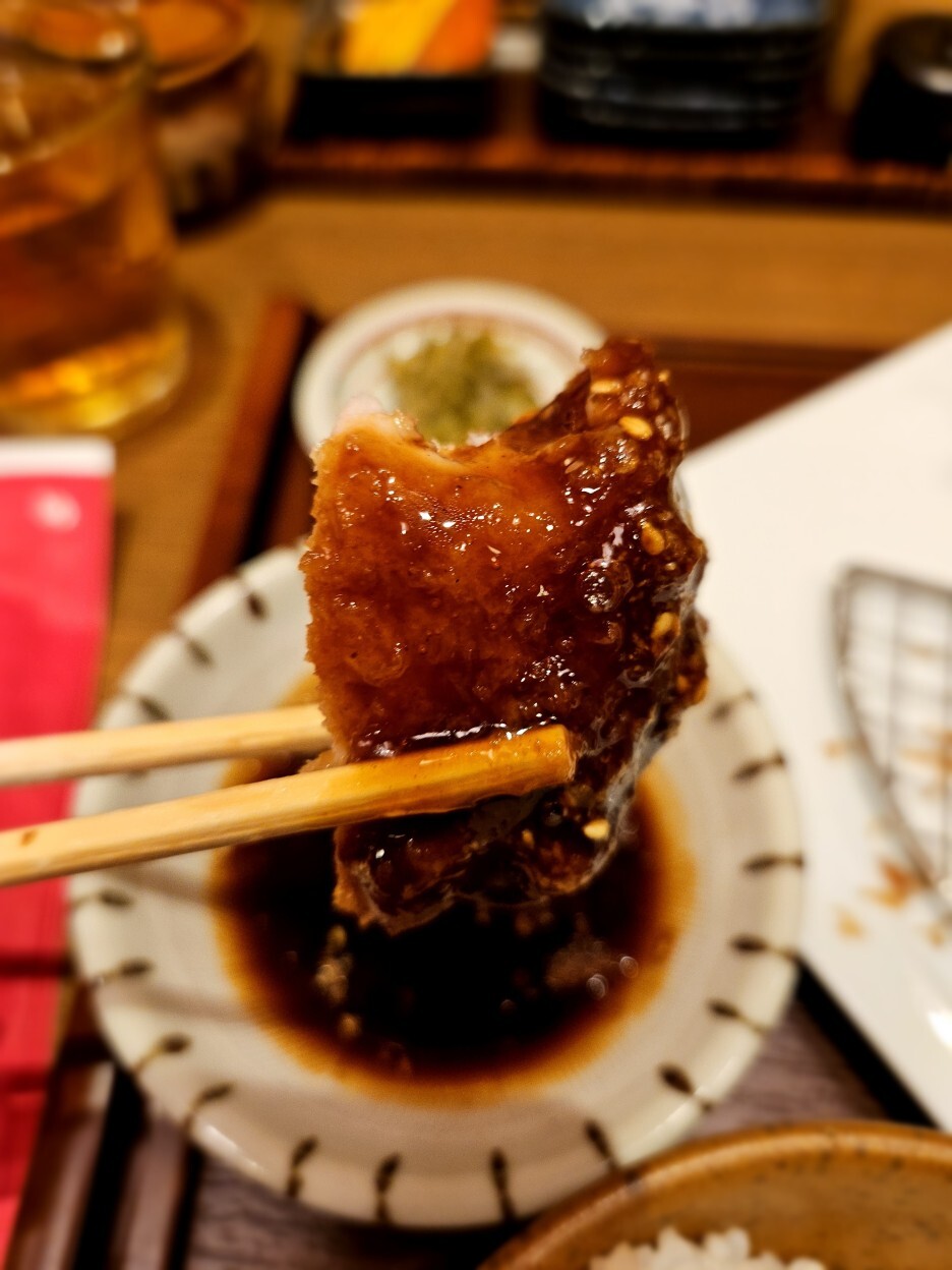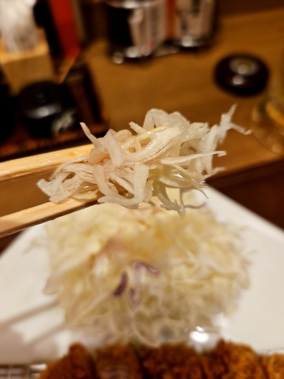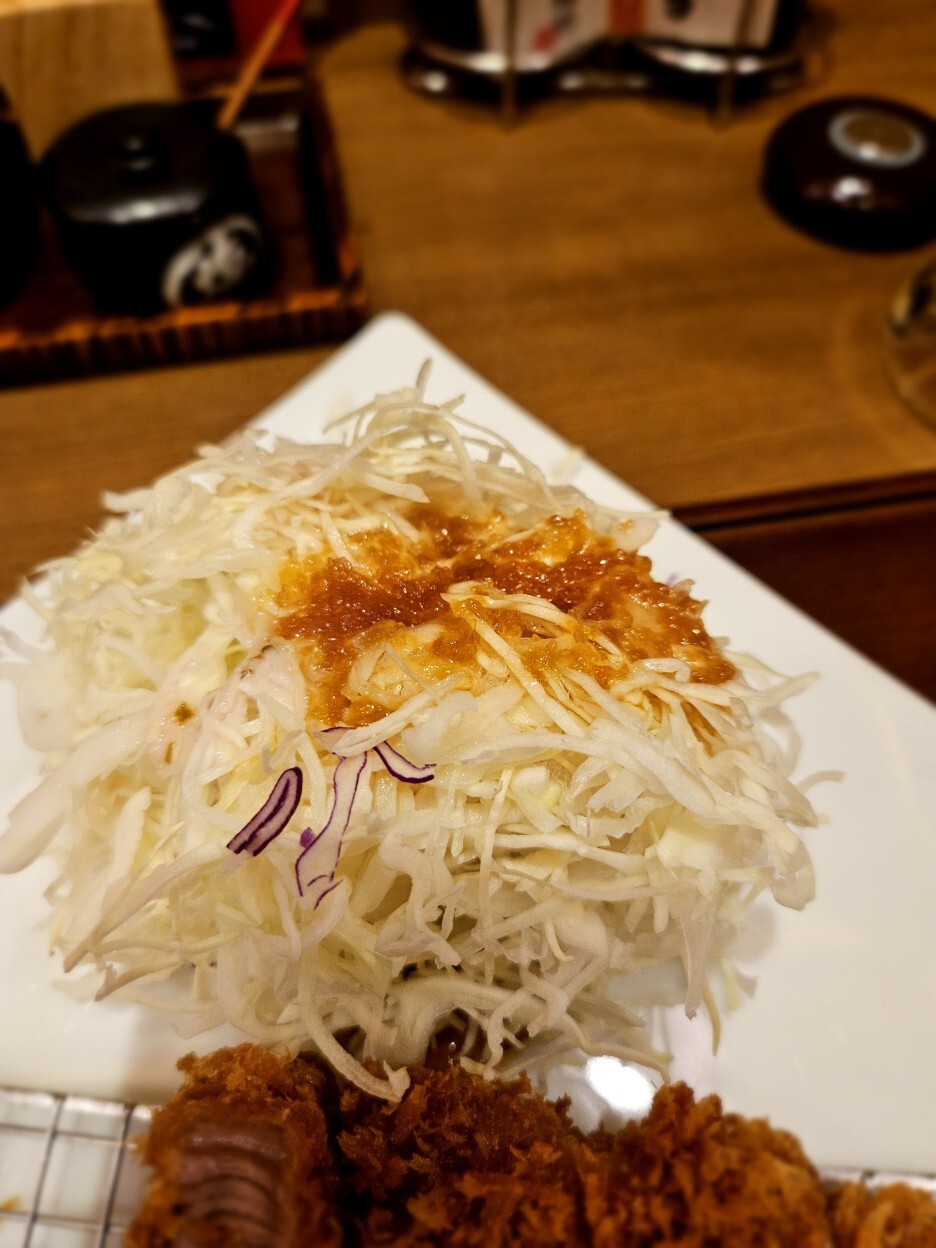 먼저 클래식하게 일반 돈가츠 소스에 한입. 소스에 갈은 참깨가 함께 찍혀 올라오니 향이 꽤 강하다. 기름진 고기 튀김에 썩 잘어울리는 맛이다. 로스의 비계부분과 어울어지면서 고소함이 폭발하는 형태다.