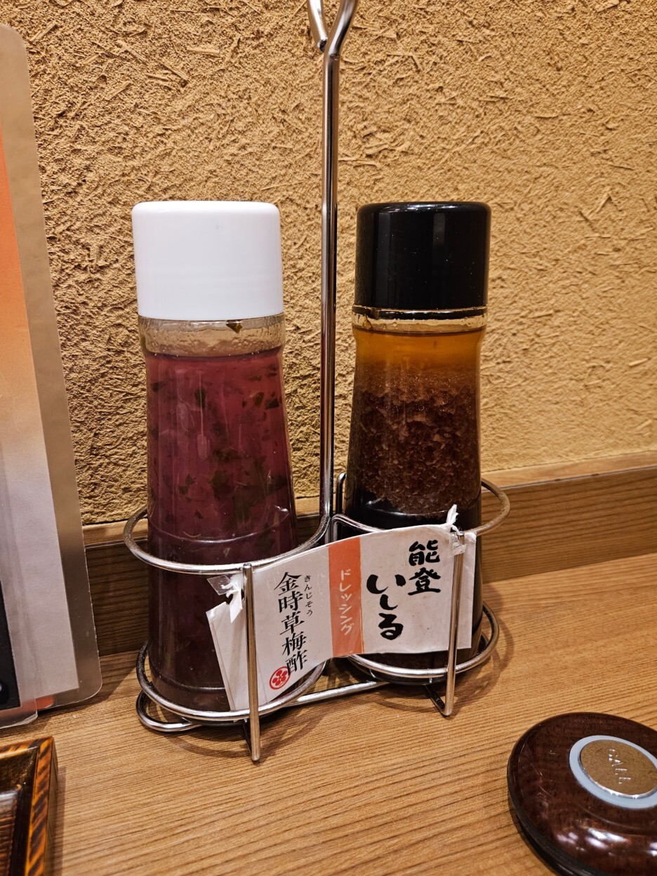 야채소스가 두가지였었는데, 하나는 우메(매실)이 들어간 것으로 신맛이 나서 그다지 별로였다. 우메보시 좋아하는 일본사람은 좋을지도. 이시로 라는 이름의 다른 소스는 우리가 늘 먹던 간장베이스의 참깨향 드레싱이었다. 이쪽이 더 입맛에 맞았다.