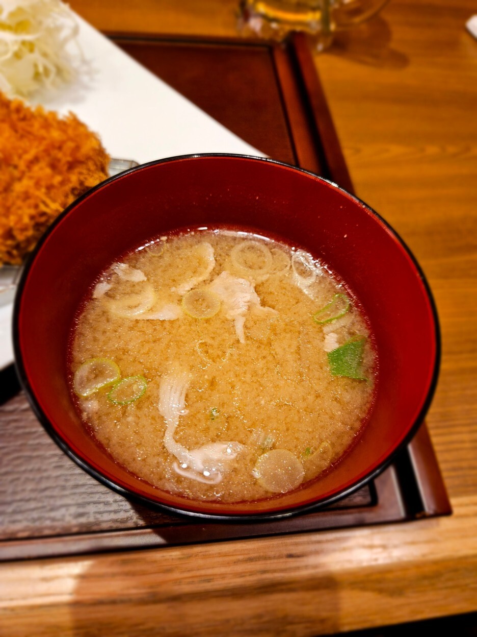 熟成 能登豚ロースかつ定食, 숙성 노토부타 로스카츠 정식. 가격이 상당하다, 2300엔. 정식이라 함께 나온 밥과 된장국. 이 두가지는 무한 리필이 된다고 한다. 또한, 밥과 된장국은 선택이 가능하다. 밥은 그냥 흰밥이냐 현미밥 중 고를 수 있고, 미소시루도 돈지루와 노리(김)미소 중 고를 수 있다. 난 잠시 딴 생각을 하다 미소시루 종류를 못들어서 그냥 "미소지루"를 달라 했더니 당황하는 종업원분. 다시 설명을 해주셔서, 돈지루로 선택했다.