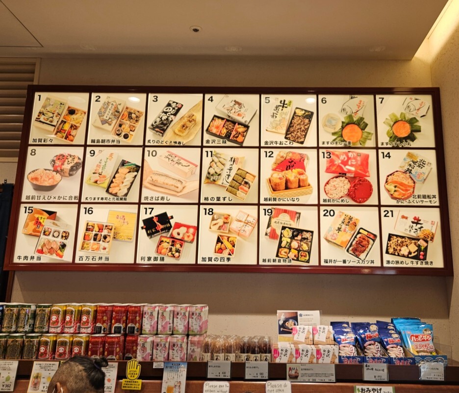 점포에 들어가면 이렇게 크게 판매 중인 도시락 에키벤들을 크게 붙여두었다. 가나자와 특산품부터 일반적인 도시락들로 다양하게 구성되어 있는듯하다.