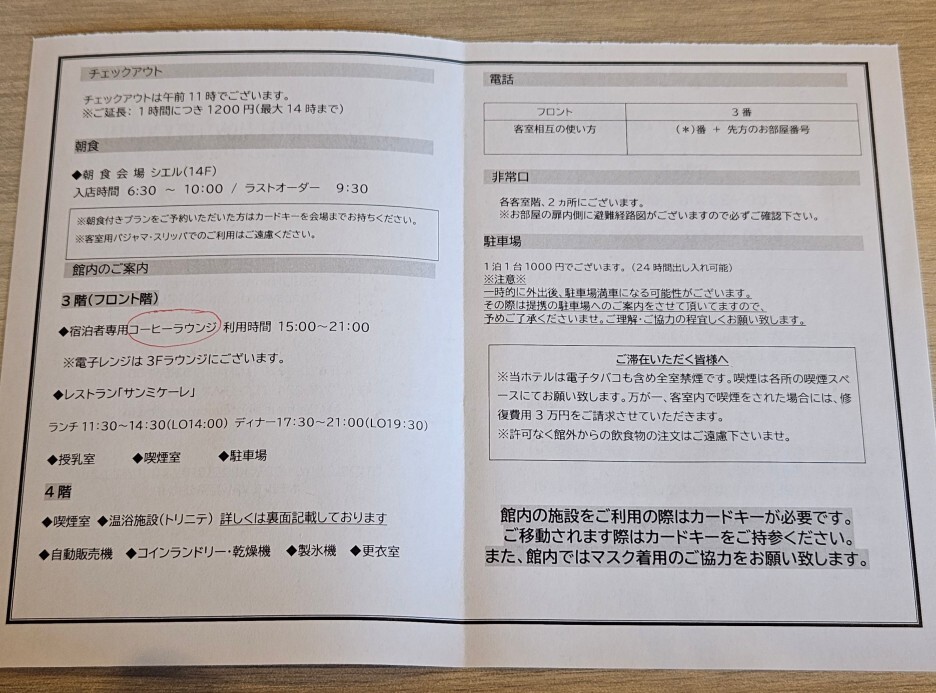 간단한 시설 안내. 대욕장 토리니테는 4층에 있고, 오후에는 17:00~23:00까지, 오전에는 6:00~9:00까지 운영한다. 나중에 여기 대욕장에 갔다가 깜짝 놀랐다. 어떤 일이었는지는 아래 대욕장 소개 시 말씀드리겠다.