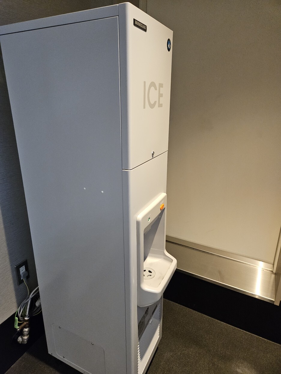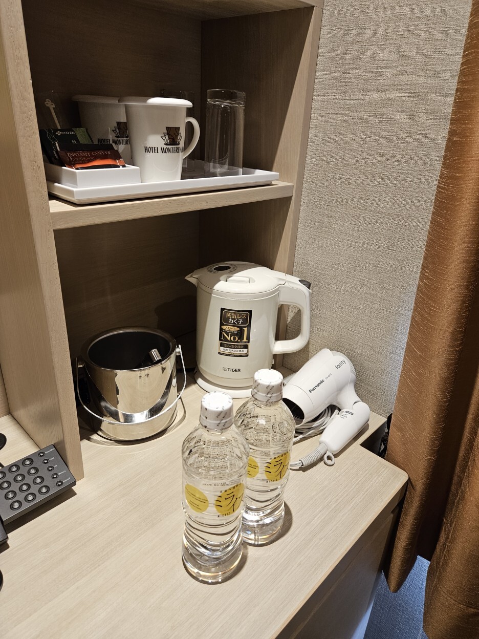 무료로 물을 2개나 주었다. 아주 훌륭하다. 나에게 항상 필요했던 아이스버킷도 있고, 다양한 잔과 커피포트, 헤어드라이기가 있다. 아래에는 냉장고가 있다.