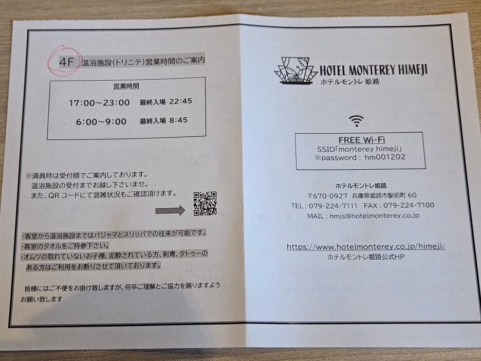 실제 이용한 호텔 몬테레이 히메지는 훌륭하고 다양한 부대시설을 가지고 있었고, 일본의 평균 호텔보다 넓은 방, 그리고 역과 가까운 위치로 아주 좋았다. 역에 붙어 있다 보니, 주변에 많은 상점가와 쇼핑몰이 있어 아주 편리했다. 히메지 여행을 간다면 반드시 고려해 볼 만한 호텔이다.