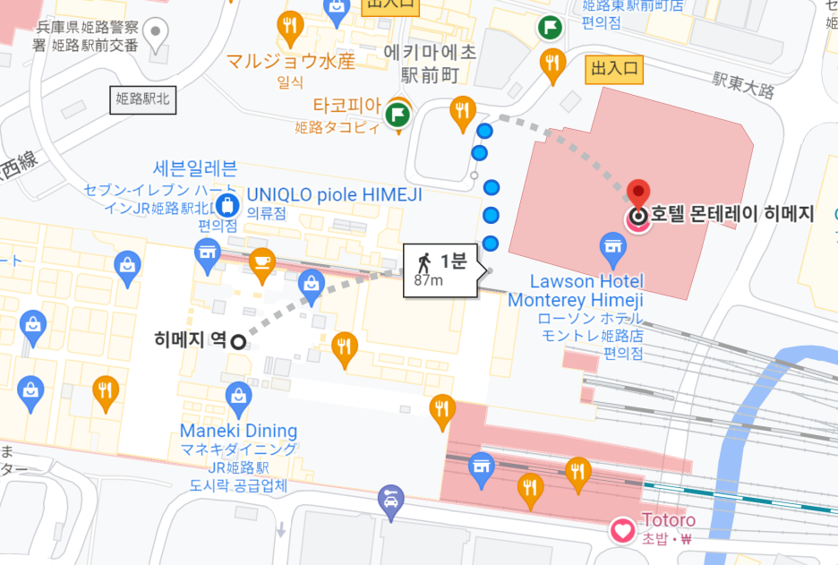 호텔 몬테레이 히메지는 히메지역에 바로 붙어 있다고 생각하면 된다. 도보 2분이라고 써두긴 했지만, 도보 몇 분이라고 이야기하기에는 조금 어울리지 않는다. 히메지역에서 2층으로 가면 피오레라는 쇼핑몰로 연결이 되고, 2층의 외부 통로로 나가면 호텔과 연결되는 통로가 있다. 해당 통로로 이동하여 호텔로 들어갈 수 있는 구조. 조금 걷기는 하지만 그냥 히메지역과 연결되어 있다고 생각하면 되는 형태이다.