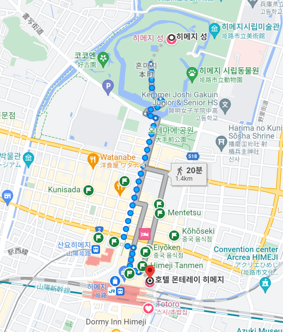 히메지의 가장 유명한 관광지인 히메지성까지의 거리는 약 1.4km로 걸어서 20분 정도 소요된다. 하지만, 직선으로만 쭈욱 가면 되고, 완전 평지라서 전혀 힘들지 않게 히메지성까지 갈 수 있다. 중간에 상점가들도 많고 다양한 볼거리들이 있으니 구경 삼아 걸어가면 어느새 히메지성에 도착한다.