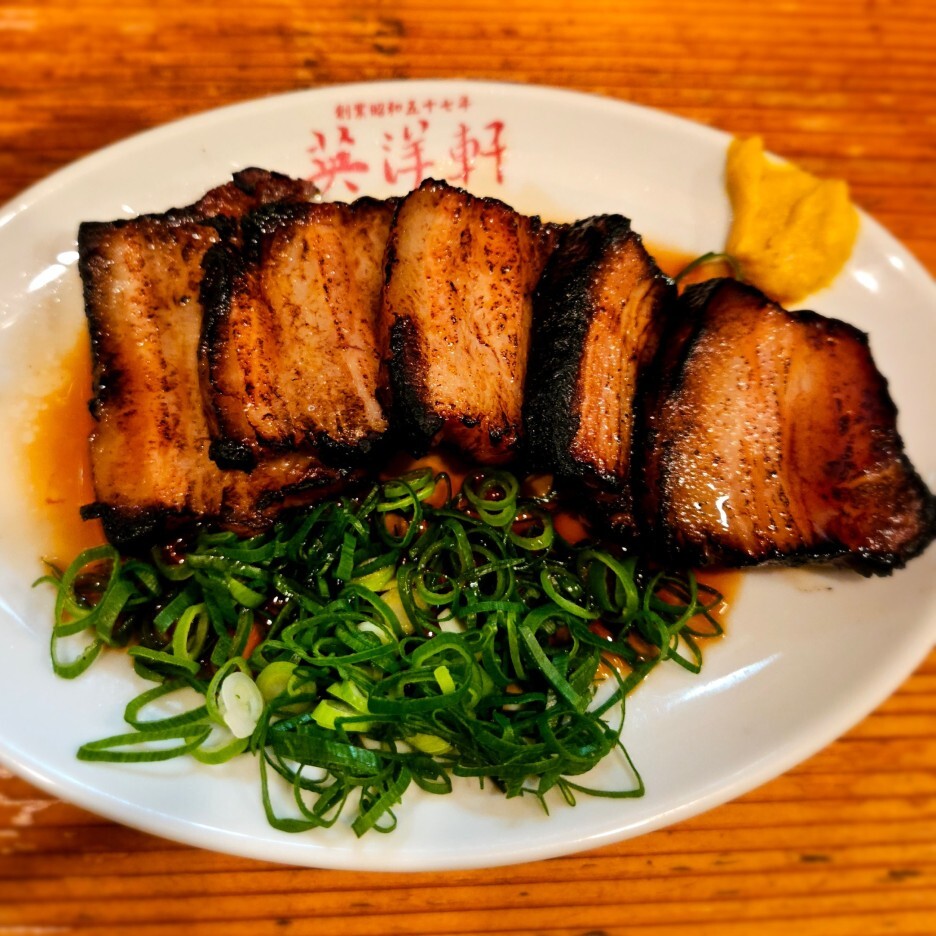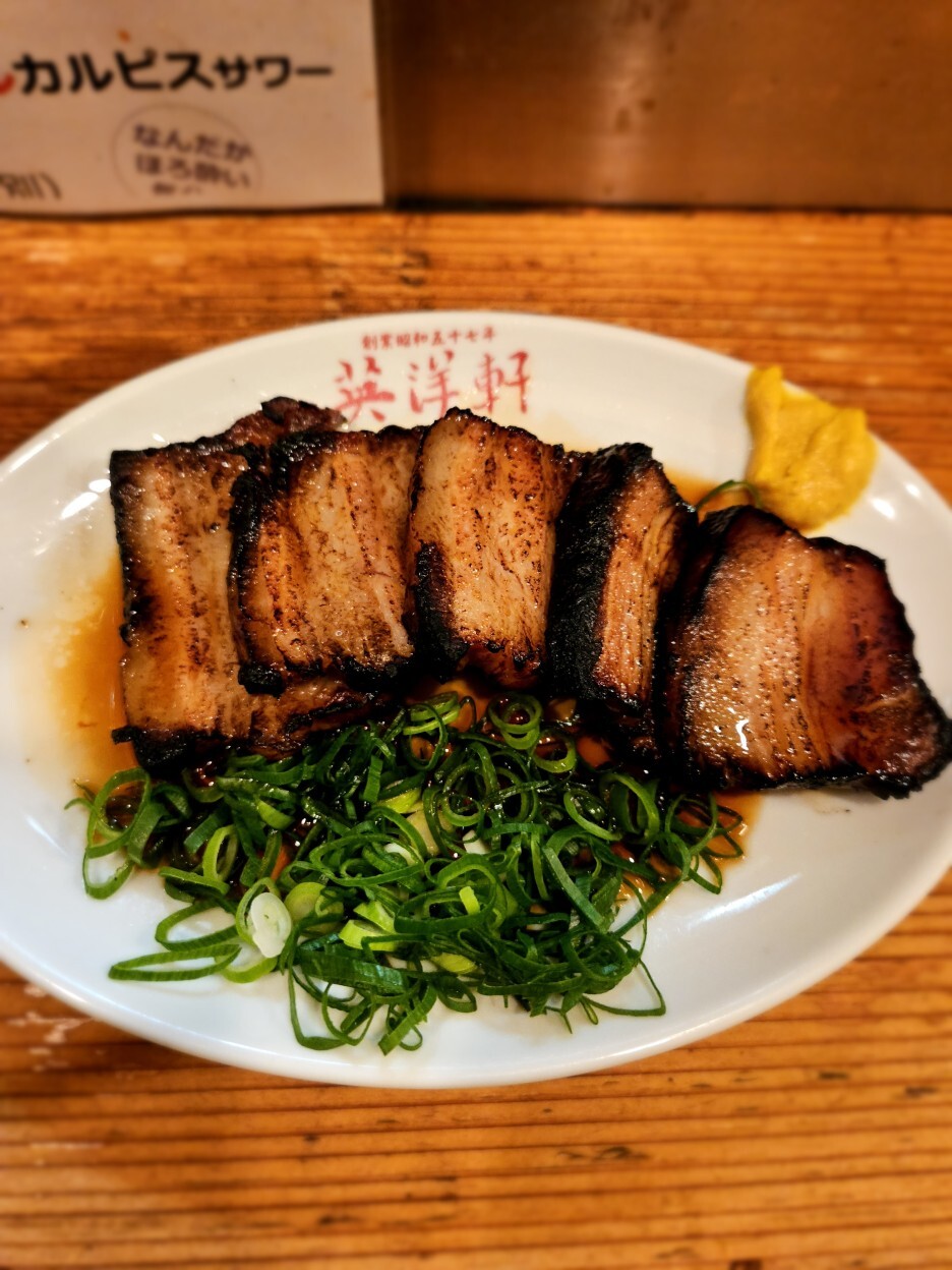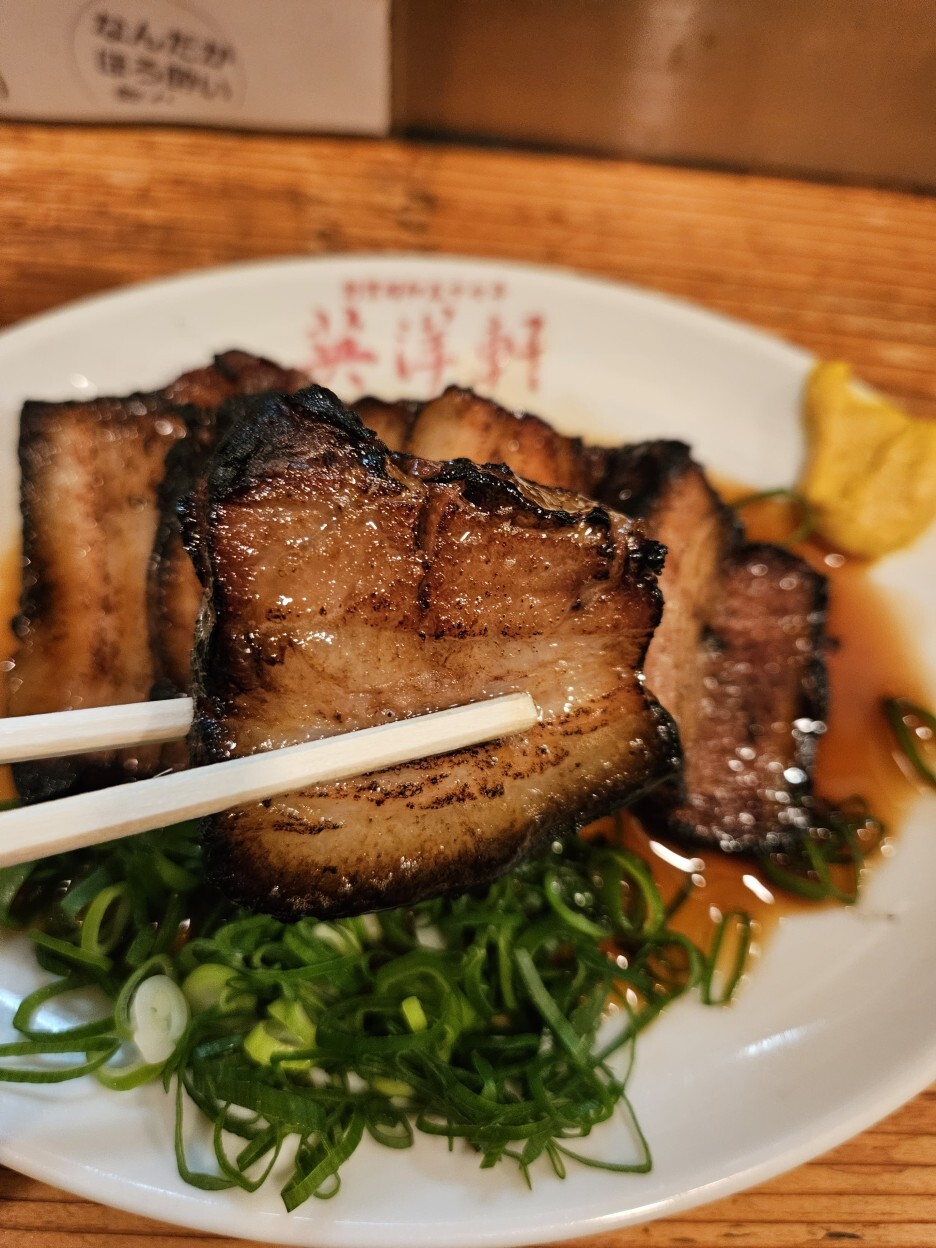 이거 정말 맛있다. 라멘에 올라가는 차슈의 느낌인데 불질을 마구 해서 살짝 탄 느낌이지만 이게 바삭함을 올려준다. 한입 씹으면 바삭한 삼겹살 껍질 안에 부드러운 고기가 등장. 기름의 맛도 좋다.