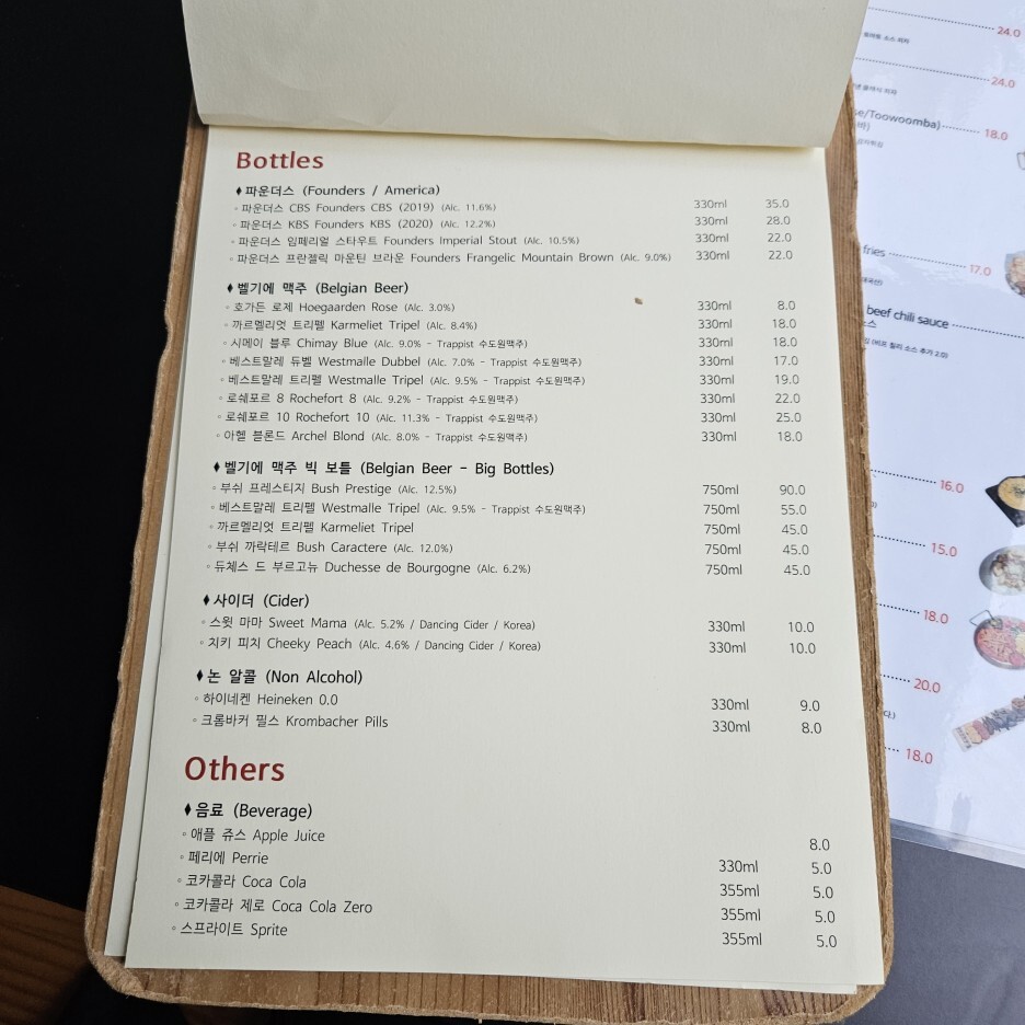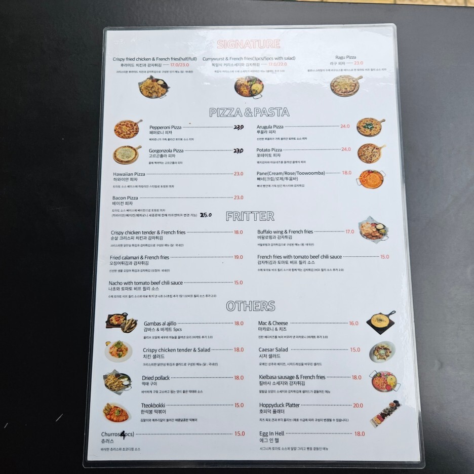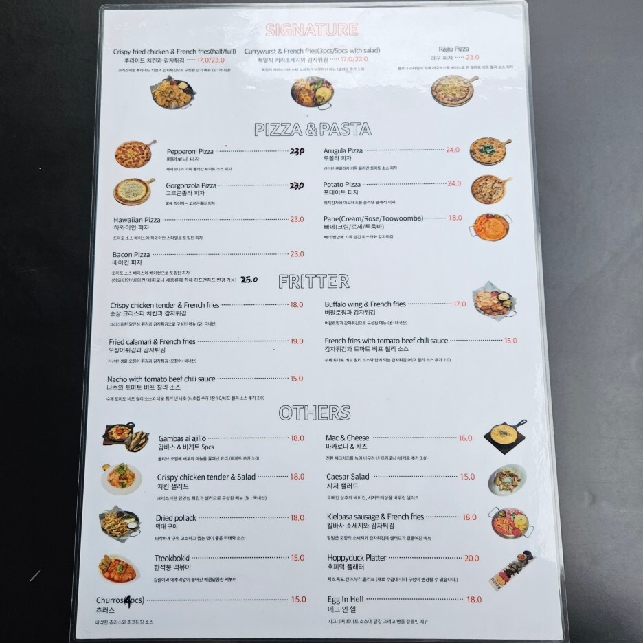 치킨뿐만 아니라 피자, 파스타, 칼라말리, 감바스, 소시지 등 다양한 안주가 있다. 맥주 안주뿐만 아니라 식사를 해결하러 갈 만한 구성의 메뉴들이다.