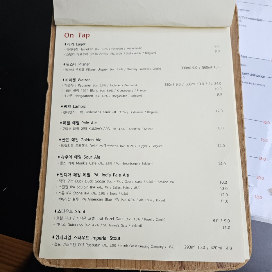 특히, 4월~6월, 9월~10월 정도는 덥거나 춥지 않아 테라스에서 풍경을 감상하며 맥주 한 잔으로 좋은 시간을 보내기에 아주 좋은 시기. 나도 이 시기를 맞아 호피덕을 찾았다. 맥주 메뉴부터 살펴본다.