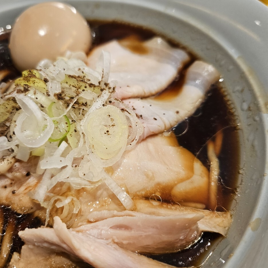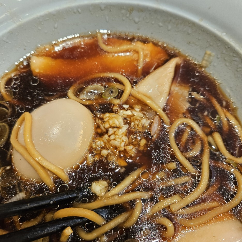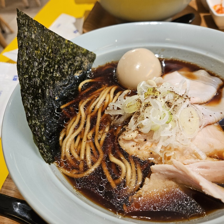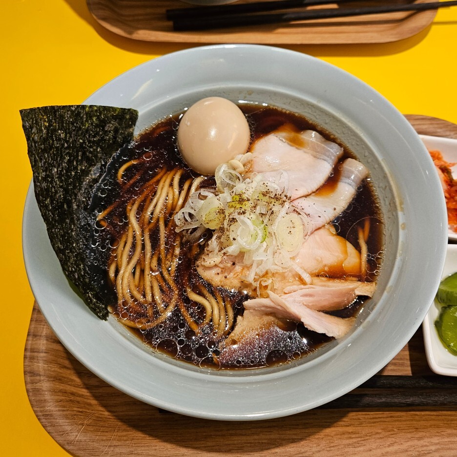 오늘의 한정 메뉴인 중화소바. 아주 시커면 쇼유베이스의 국물에 돼지고기 차슈와 김, 그리고 삶은 계란까지. 면은 꽤 두꺼운 편이다.