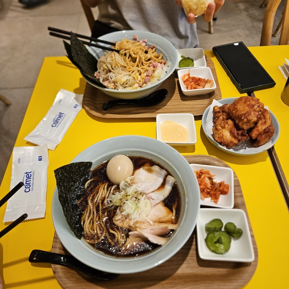 우리는 중화소바와 아부라소바, 그리고 사이드로 가라아게를 주문했다.