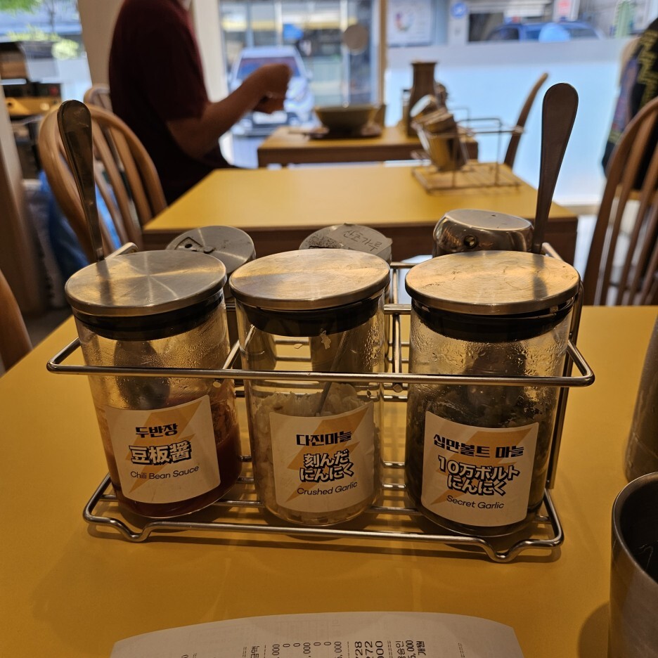테이블에는 각종 소스가 함께 비치되어 있다. 뒤쪽으로는 식초와 시치미도 함께 놓여있다.