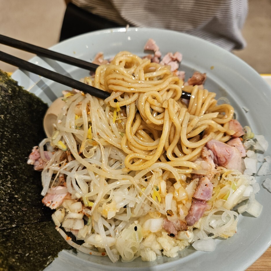 비빔라멘으로 잘게 썬 차슈와 숙주, 양파를 토핑으로 살짝 매콤한 양념이 덮인 모습이다.