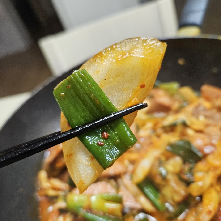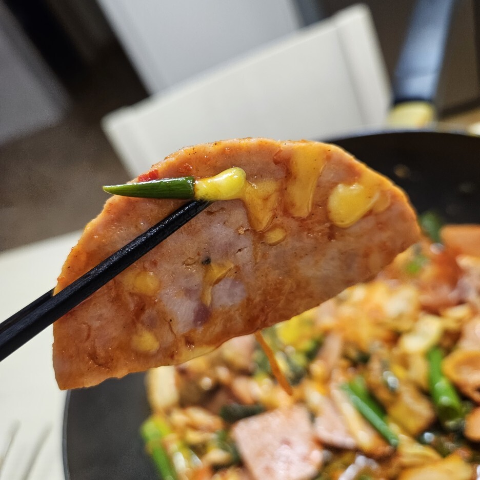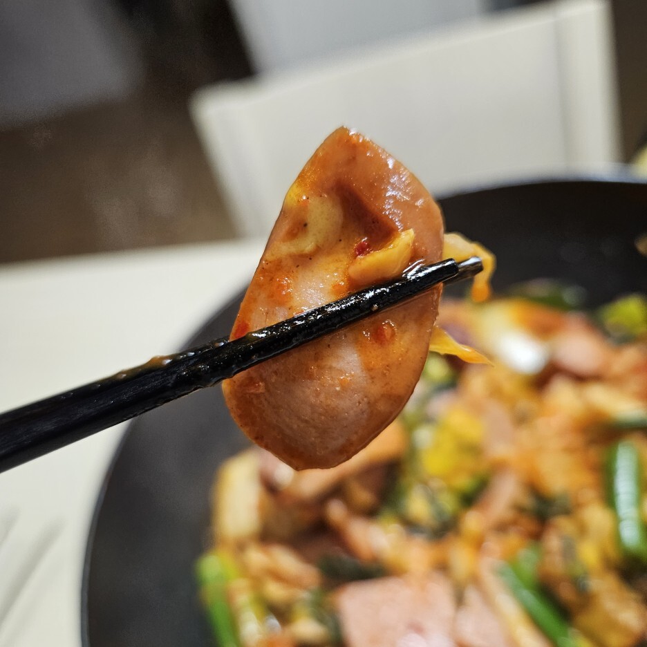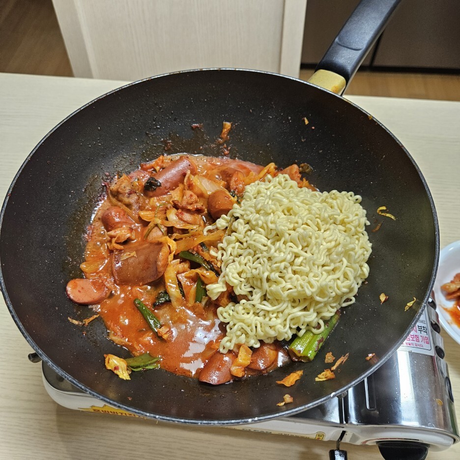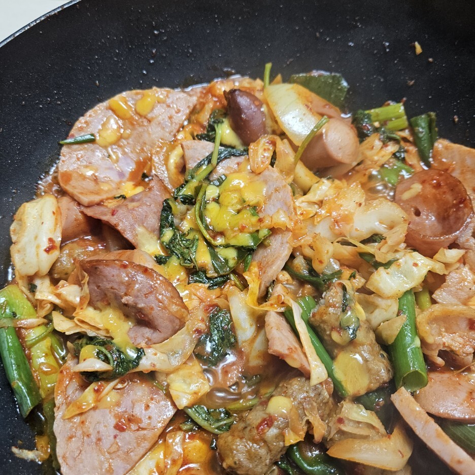 모든 중간과정은 생략하고 대략 볶아진 부대고기의 모습. 그리 보기에 좋은 모습은 아니지만, 다양한 채소와 함께 보이는 햄과 소시지가 아주 먹음직하다.