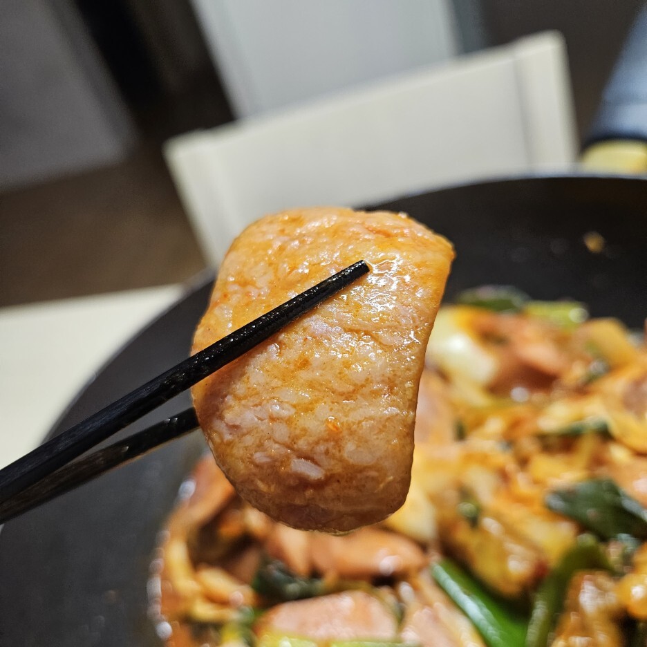 치즈도 살짝시 보이고, 평소에 먹어보지 못하는 소시지도 들어가 있는 듯한 모습. 빨간색의 양념으로 되어 있어 매울까 걱정하시는 분들이 있으실 수도 있겠으나, 전혀 맵지 않다. 오히려 살짝 단맛이 감도는 양념이다.